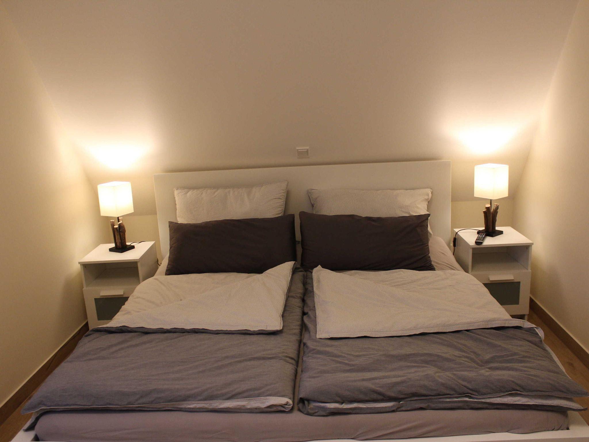 In zwei Schlafzimmern befinden sich je ein Doppelbett (180 x 200cm / durchgehende Matratze), ein Kleiderschrank bzw eine Komode und ein Flat-TV. Im Schlafzimmer im Dachgeschoss befinden sich ein Ausziehbett (160 x 200 cm / durchgehende Liegefläche) und eine Flachstrecke.