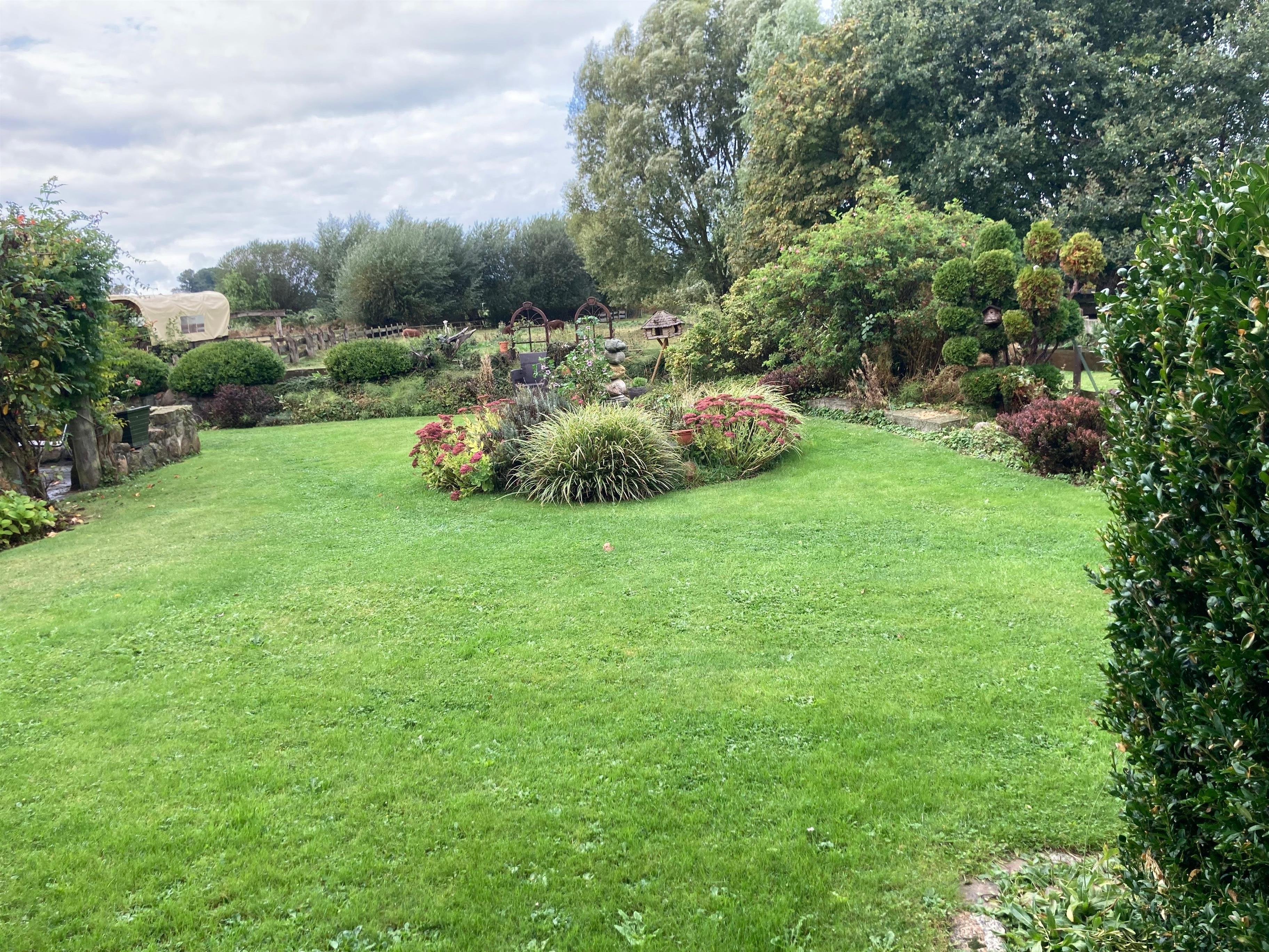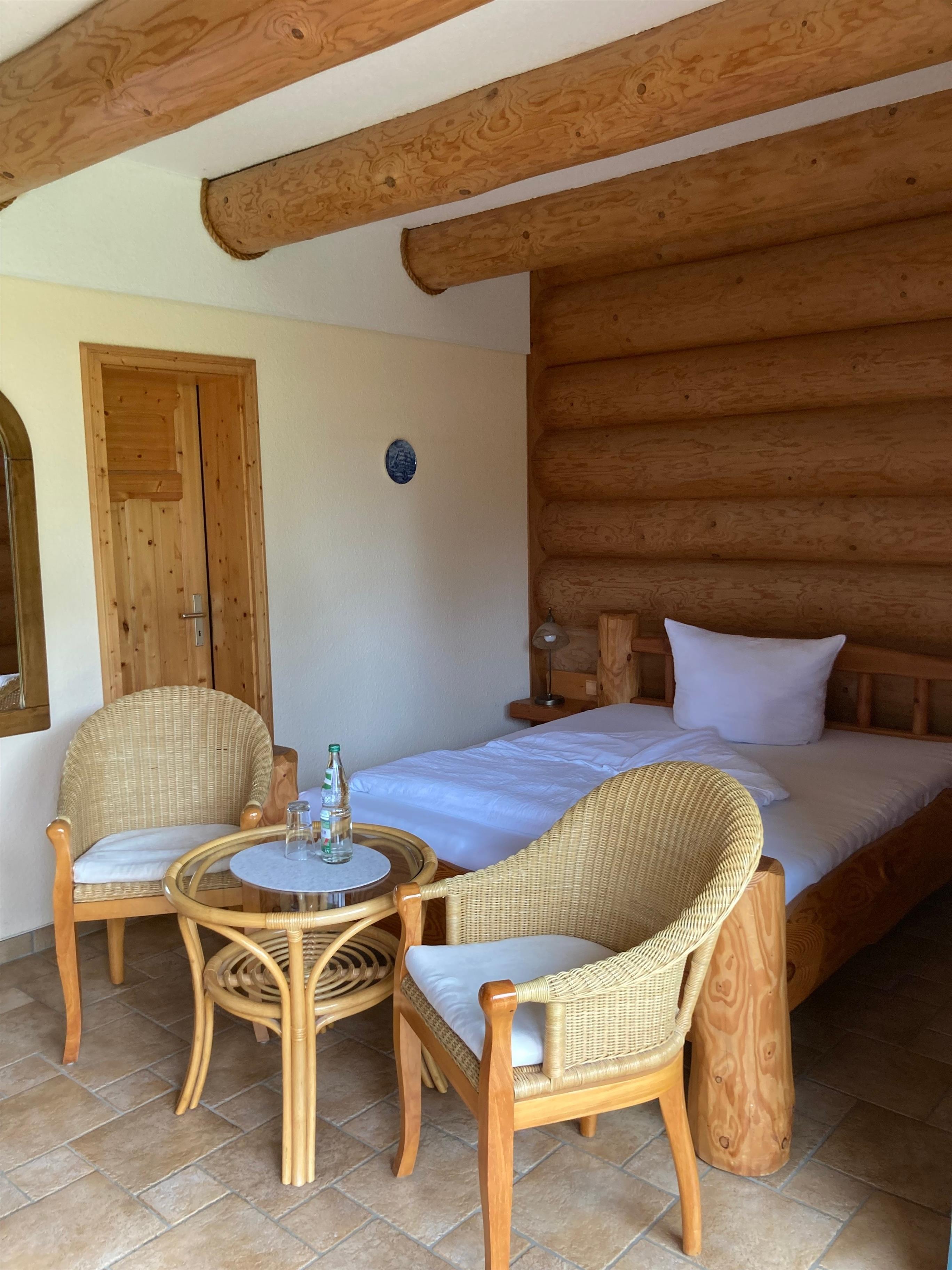 Offizierzimmer 1 hat einen tollen Ausblick auf den Garten mit direktem Zugang über eine Terasse. Neben Sitzmöglichkeiten haben Sie einen Blick auf die Alpakakoppel. Genießen Sie die Abendstimmung auf Hus un Köken.