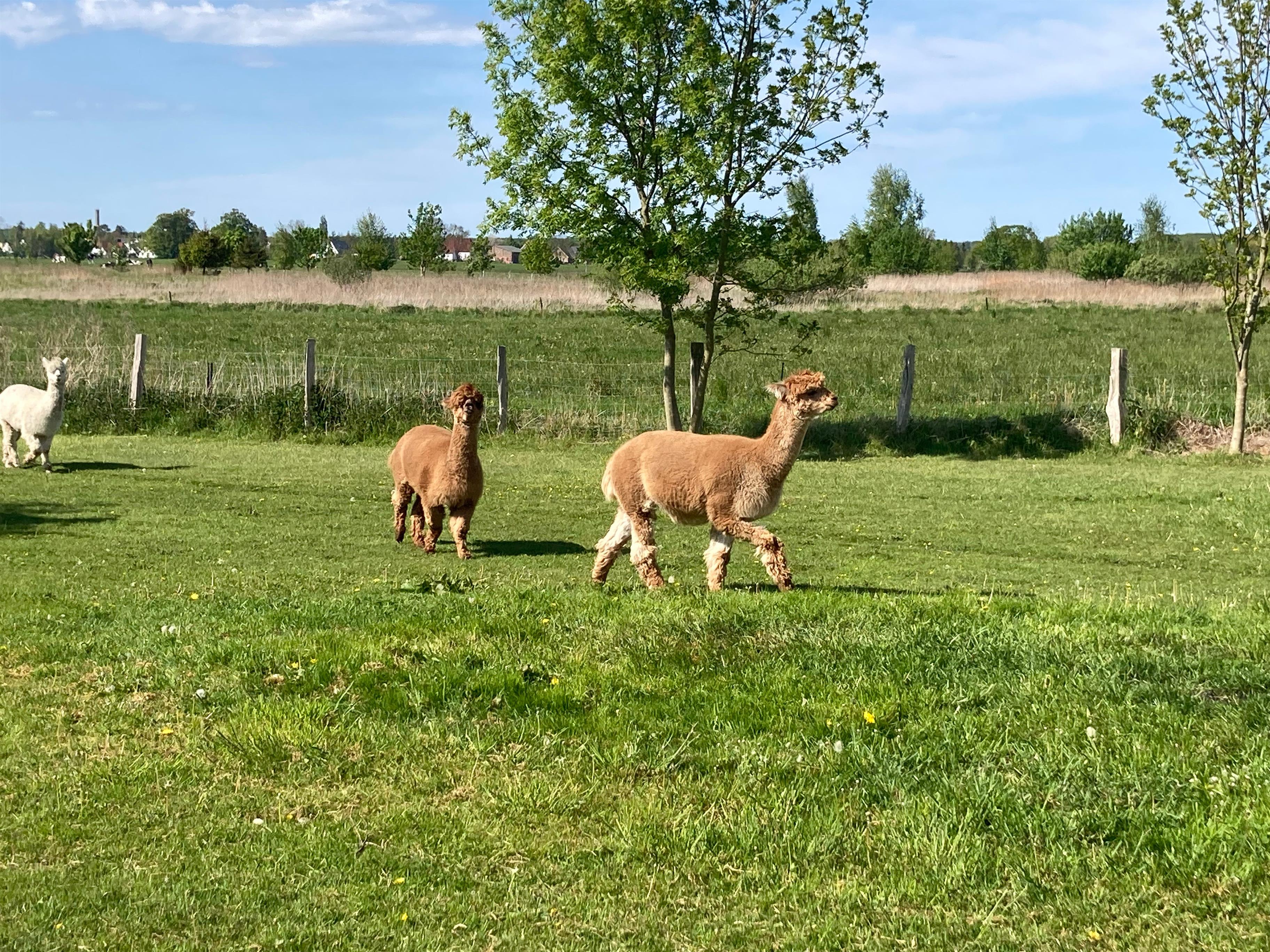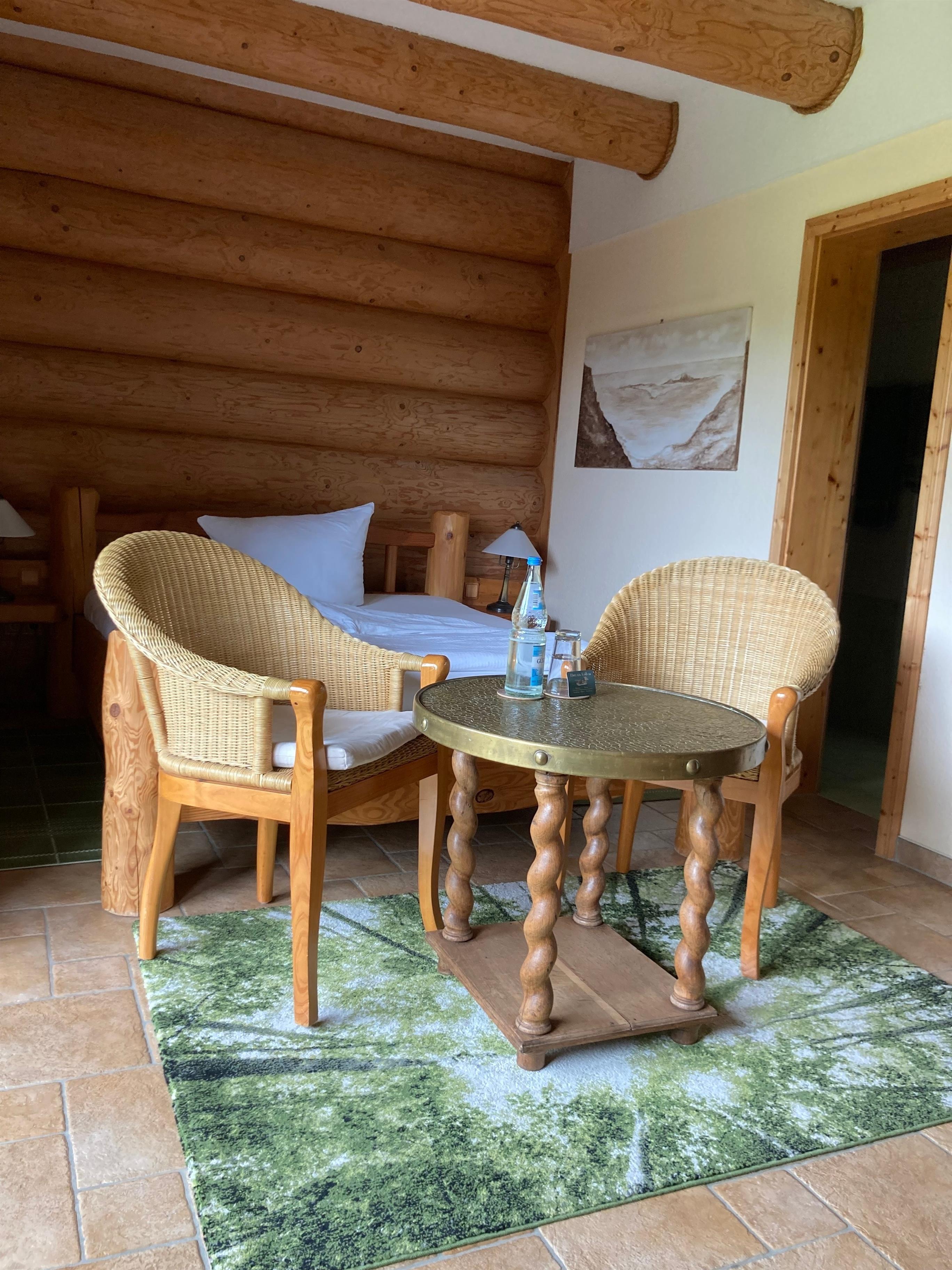 Offizierzimmer 2 hat einen tollen Ausblick auf den Garten mit direktem Zugang über eine Terasse. Neben Sitzmöglichkeiten haben Sie einen Blick auf die Alpakakoppel. Genießen Sie die Abendstimmung auf Hus un Köken.