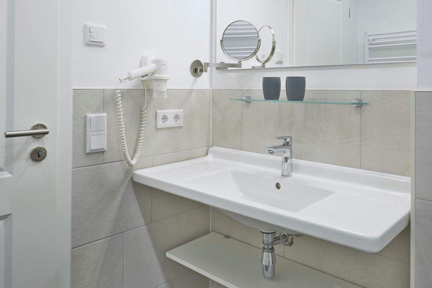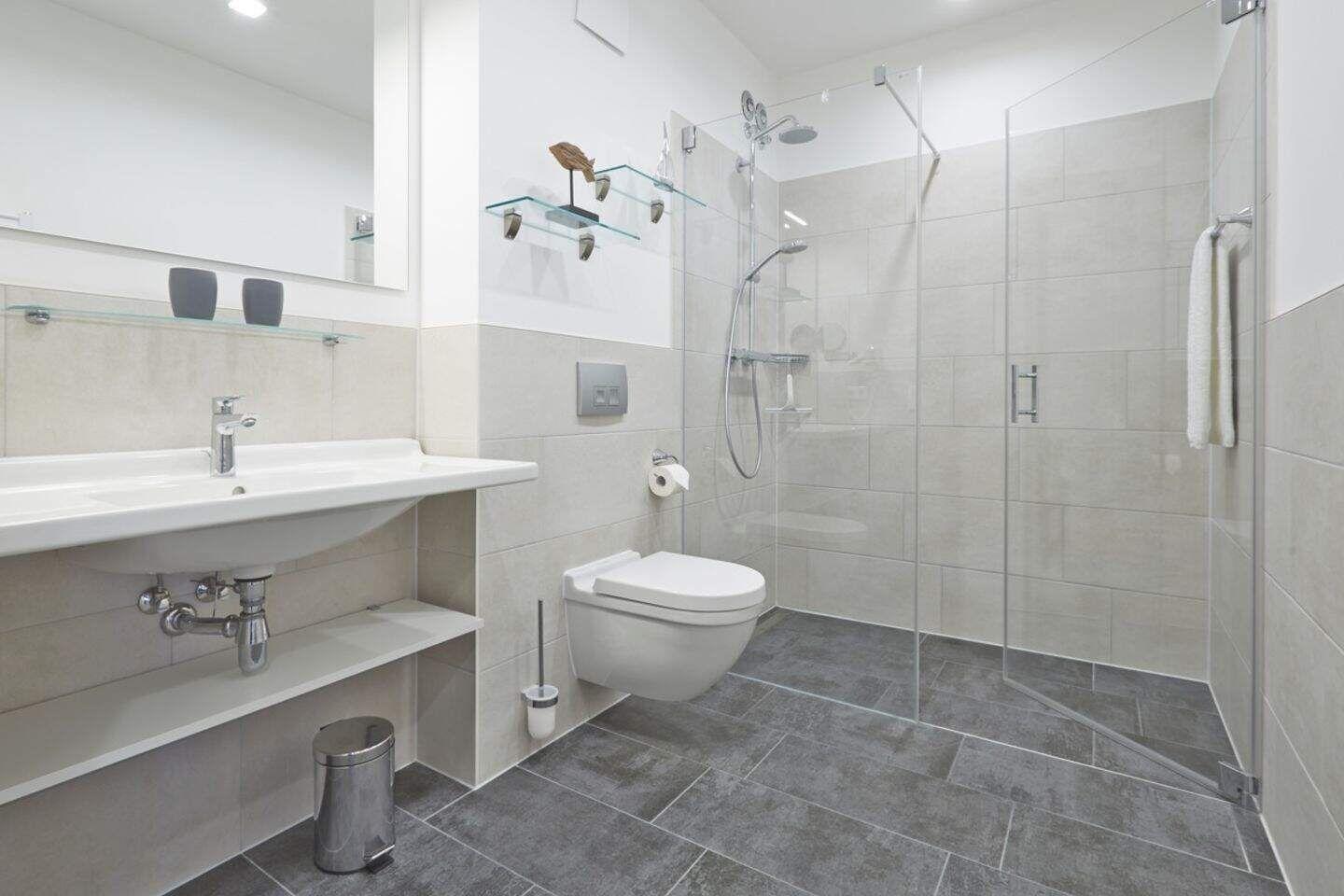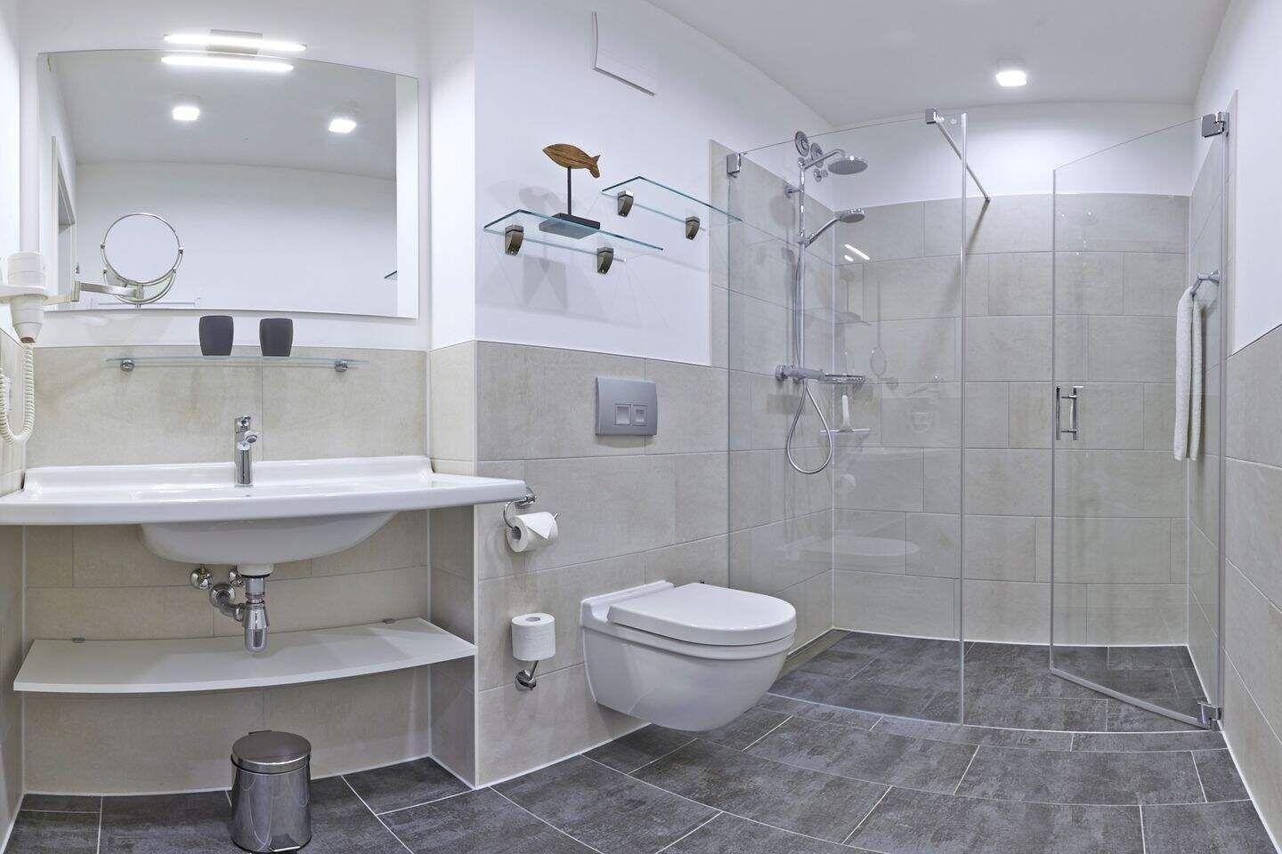 Im geräumigen Bad befinden sich eine großzügige, ebenerdige Regendusche, ein Handtuchtrockner, ein Waschtisch mit Föhn und Kosmetikspiegel.