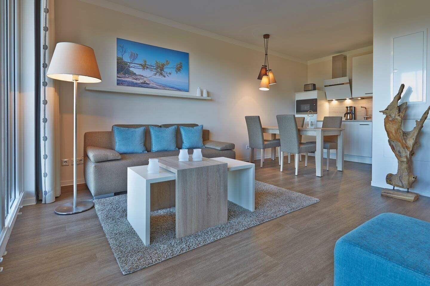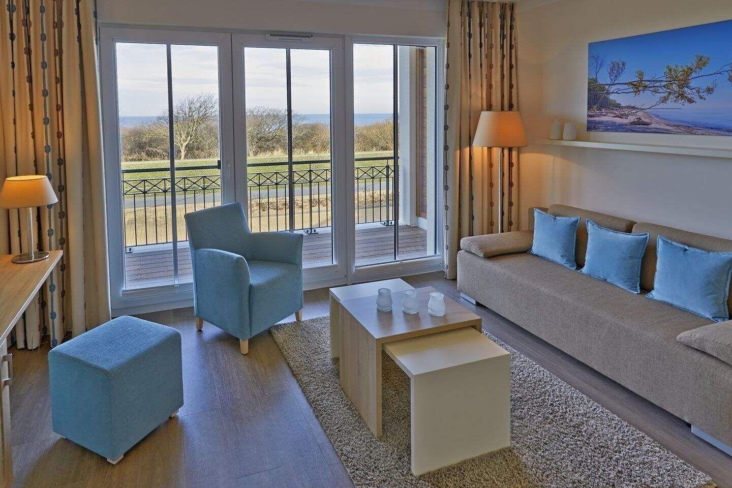 Die 49 m² große 2-Zimmer Suite ist für max. 3 Personen geeignet und befindet sich in nördlicher Lage mit Blick auf die Ostsee.