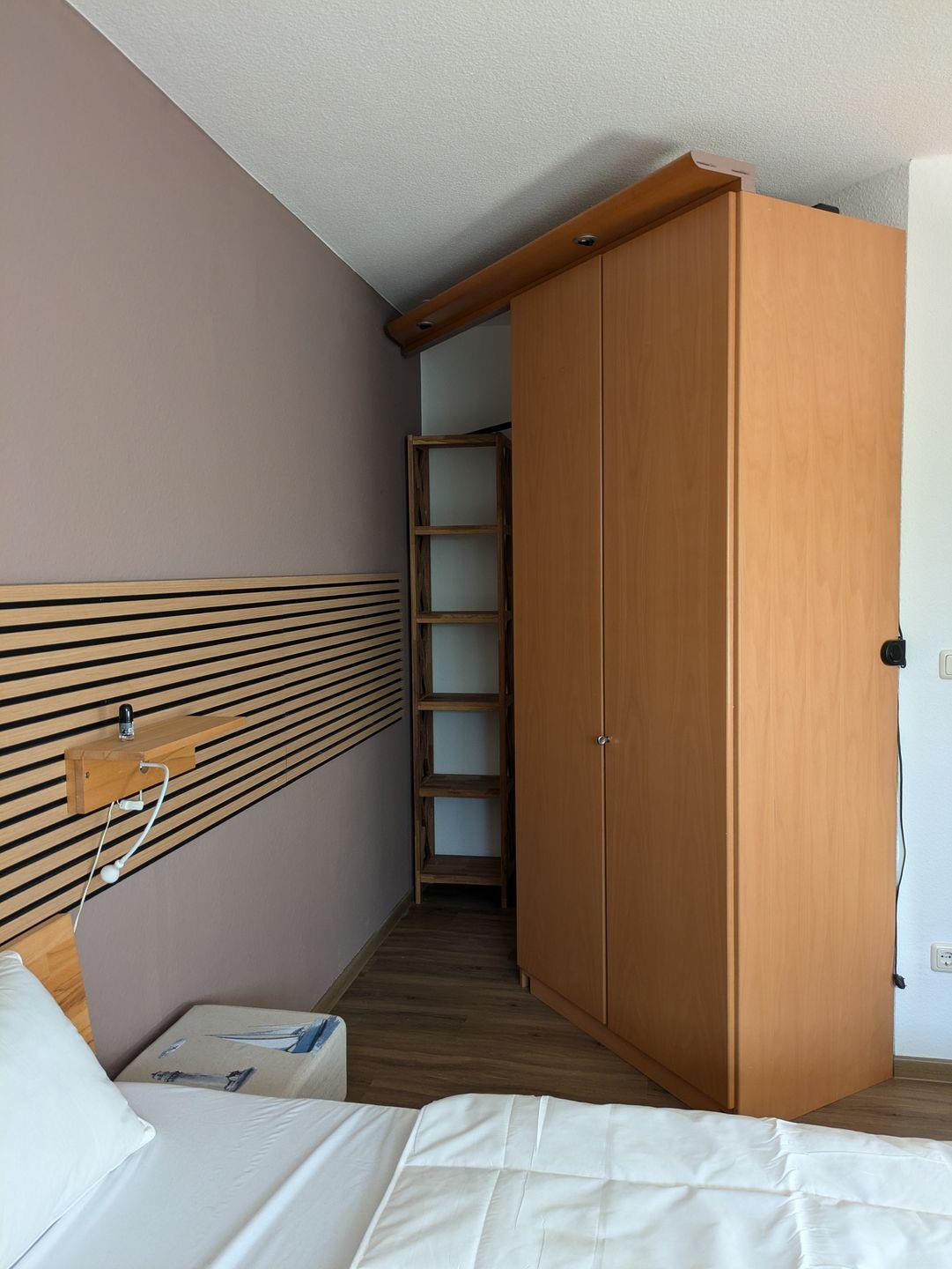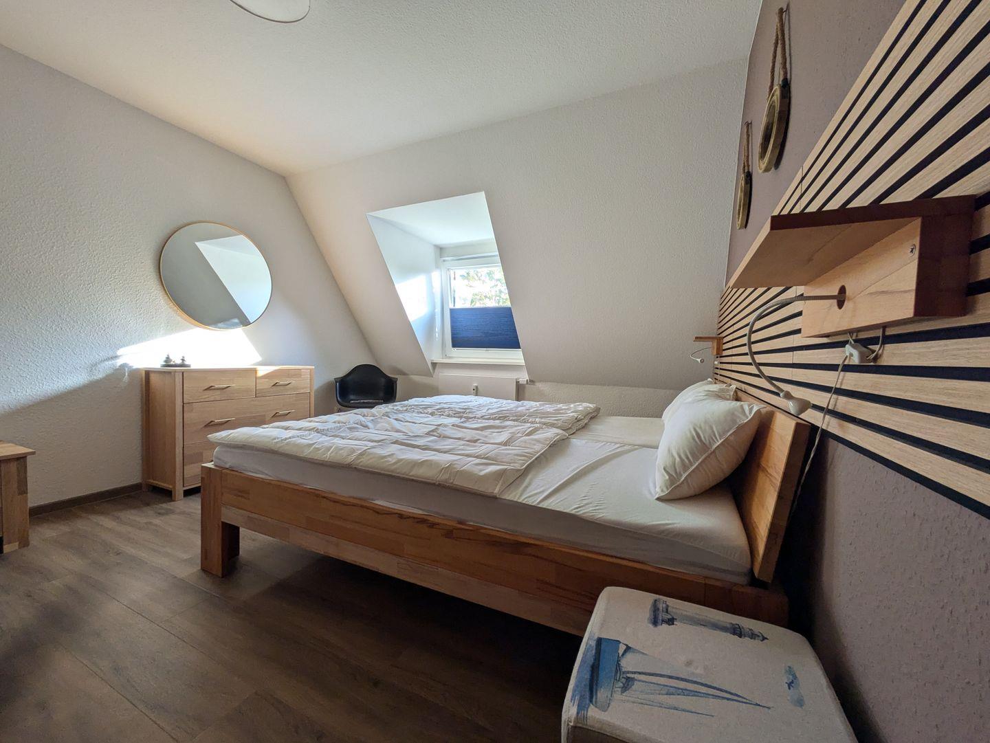 Im Schlafzimmer finden Sie ein bequemes Doppelbett (1,60x2,00m), einen geräumigen Kleiderschrank, ein Sideboard für die kleinen Dinge und ein Kinderreisebett für die kleinsten Urlauber. Im Schlafzimmer ist ein Fenster mit Insektenschutzgittern ausgestattet.