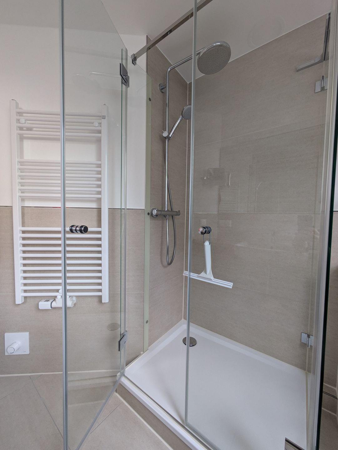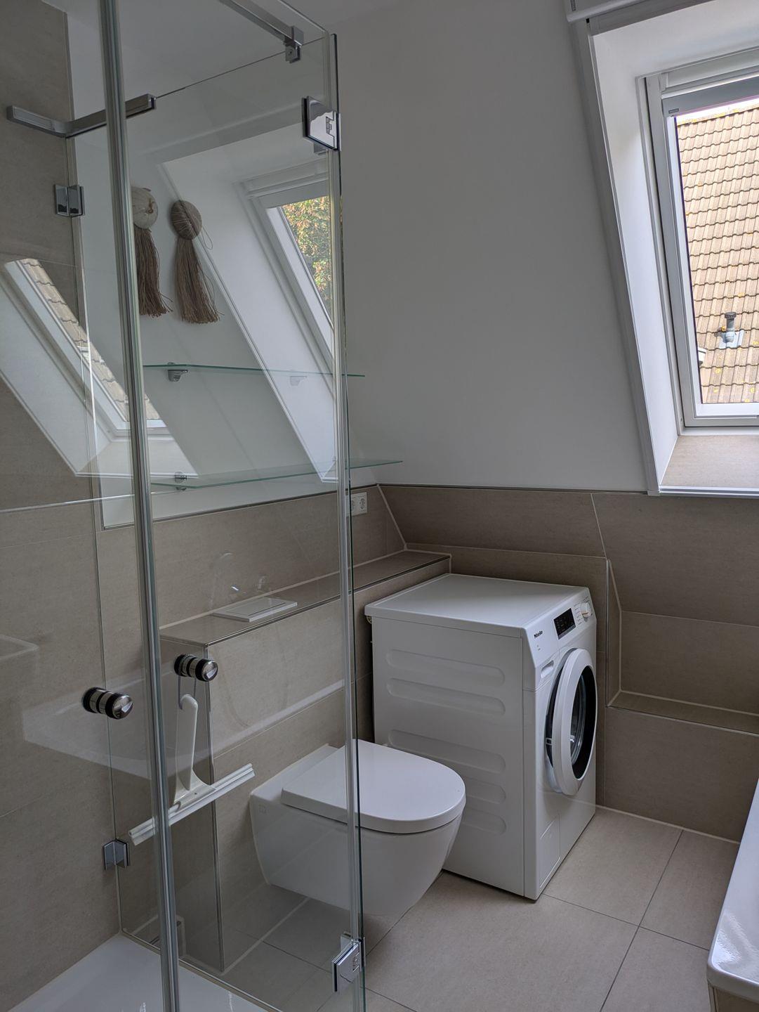 Das moderne Duschbad mit Fenster verfügt über eine Waschmaschine. Alle Räume sind separat begehbar.