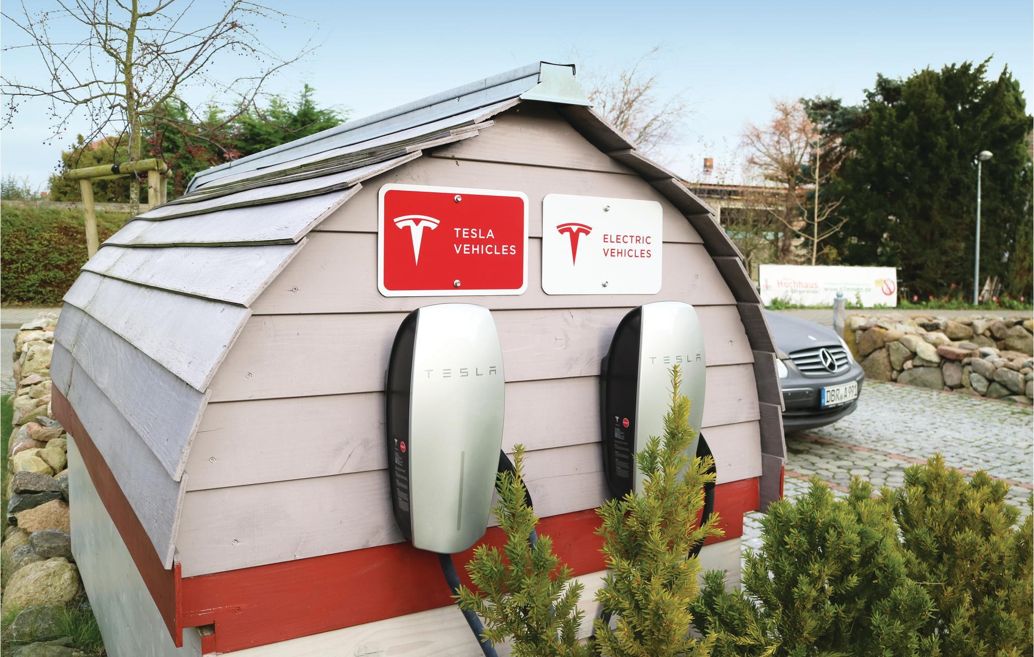 Der er ladestation til el-biler, hvor både Tesla og andre typer el-biler kan tilsluttes.