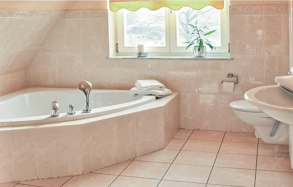 Badeværelset er udstyret med rummeligt hjørnebadekar, bruser, toilet og håndvask.