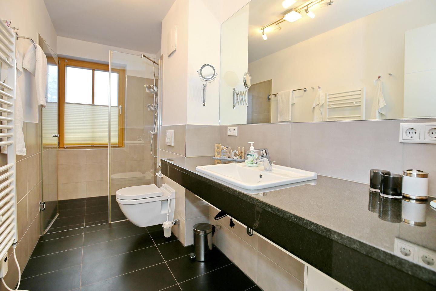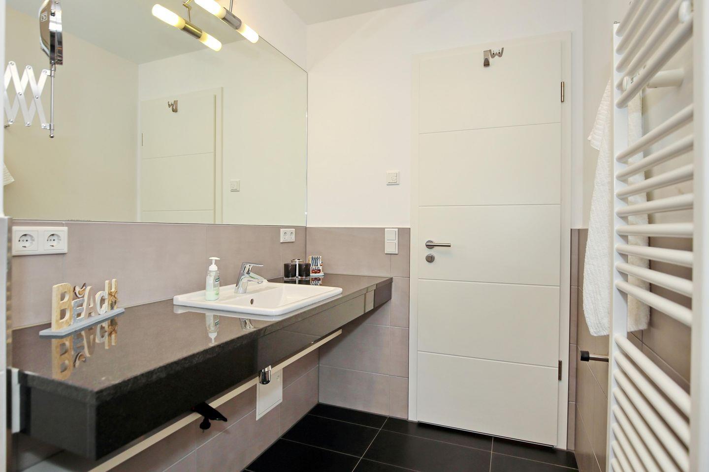 Die Ferienwohnung verfügt über ein modern gestaltetes, ebenerdiges Duschbad. Der großzügige Waschtisch bietet Ihnen genügend Platz für Ihre Waschutensilien. Ein Haartrockner komplettiert die Ausstattung des Bades. Der Nassbereich ist gefliest. In allen anderen Zimmern wurde Laminat verlegt. In dieser Nichtraucherwohnung sind Haustiere nicht erlaubt.