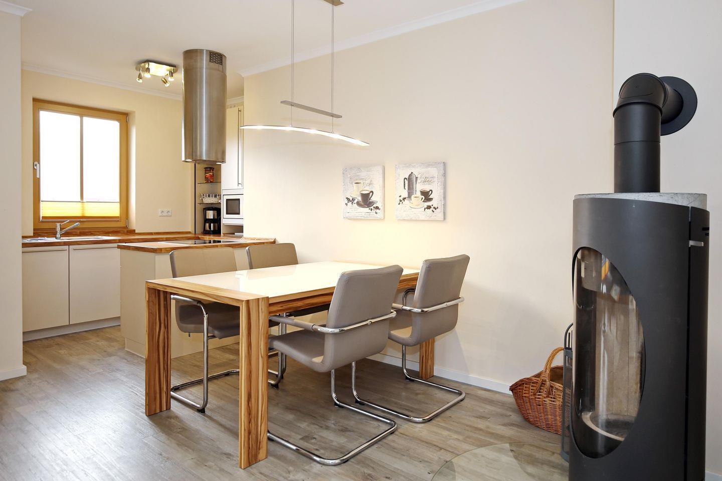 Die gut ausgestattete Küche der Ferienwohnung lässt keine Wünsche offen. Hier finden Sie für Ihren perfekten Urlaub eine Geschirrspülmaschine, Kühlschrank mit Gefriermöglichkeit und ein Induktionskochfeld mit 5 Kochplatten. Abgerundet wird die Kücheneinrichtung durch einen Toaster, einen Wasserkocher und eine Filterkaffeemaschine.