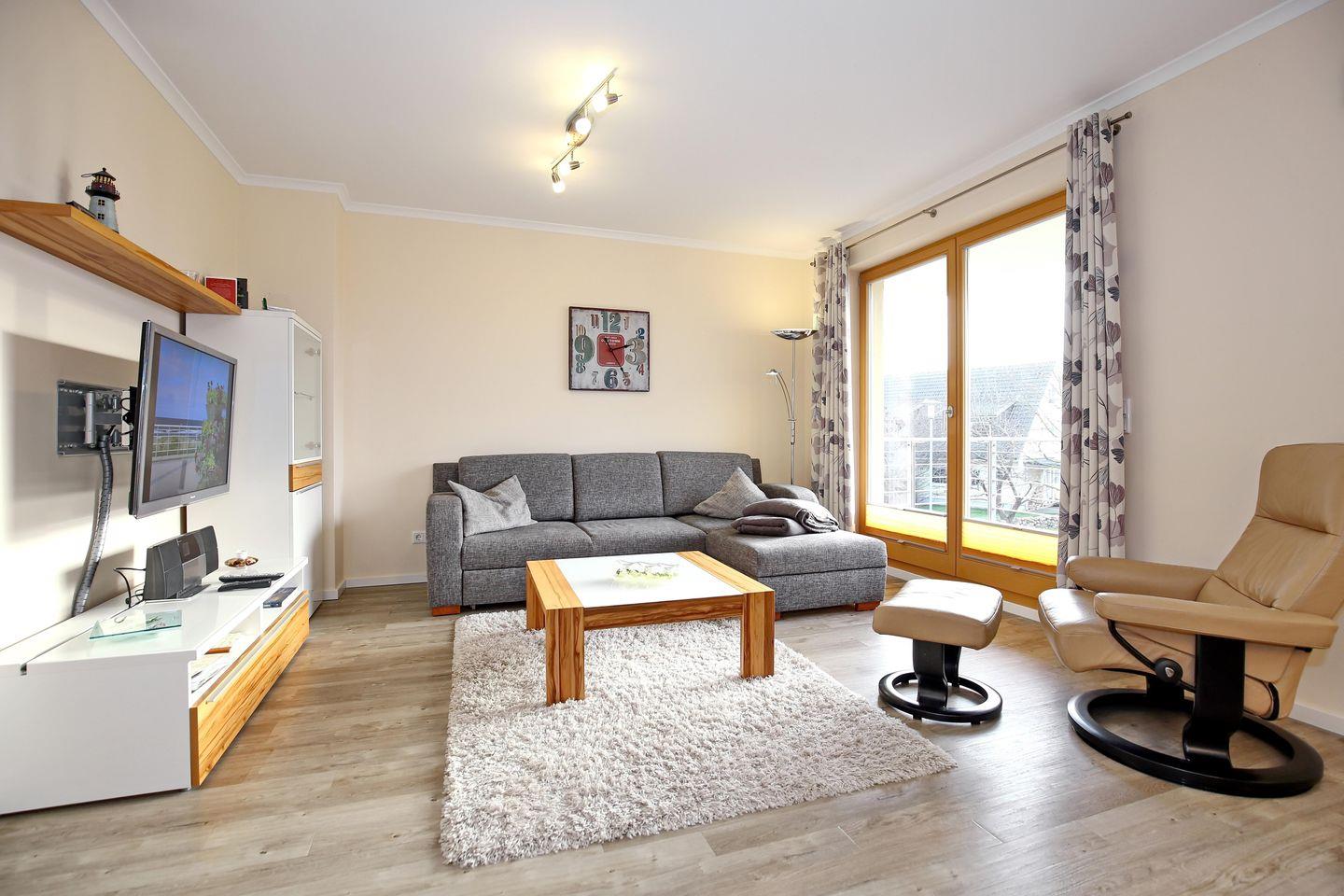 Die stilvoll und modern eingerichtete 56 m² große 2-Zimmer Ferienwohnung für bis zu 4 Personen besticht durch einen gemütlichen Wohnbereich, der zu entspannten Stunden einlädt. Die moderne Küche mit direkt angrenzendem Essbereich verspricht allen Komfort, den man sich wünscht. Die großzügige Ferienwohnung liegt in dem 1. Obergeschoss der Villa Sanddorn und ist nur 50 Meter vom Ostseestrand entfernt. Der Balkon mit Süd-West Ausrichtung lädt zum Verweilen an der Ostseeluft ein.