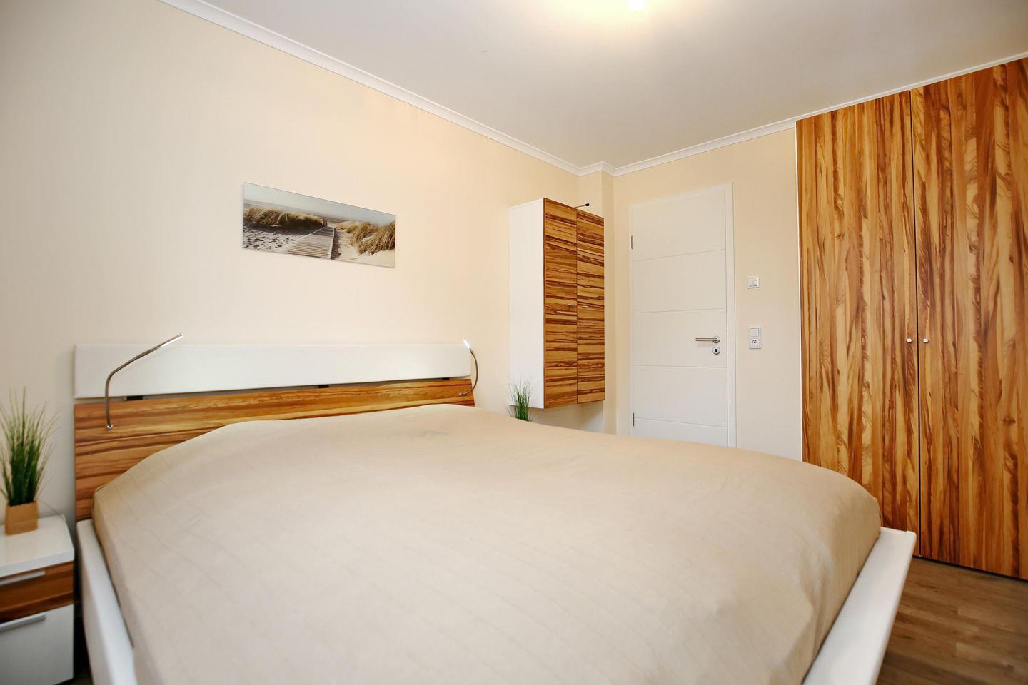 Das geschmackvoll eingerichtete Schlafzimmer in der Ferienwohnung verfügt über ein komfortables Doppelbett (2 x 90 x 200 cm) und einen Kleiderschrank, der viel Platz für Ihr Urlaubsgepäck bietet. Des Weiteren finden Sie auch hier einen Flachbild -TV vor.