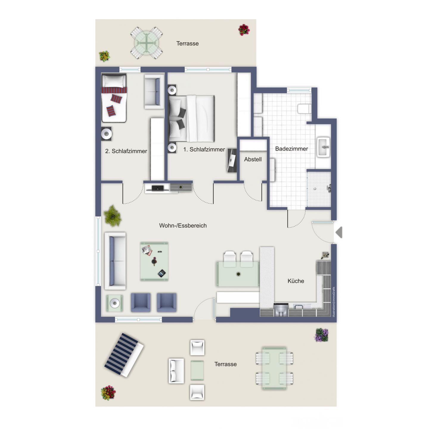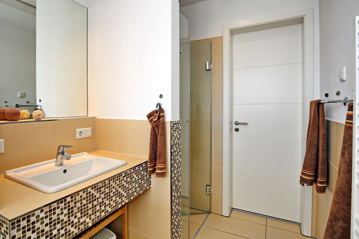 Die Ferienwohnung verfügt über ein modern gestaltetes ebenerdiges Duschbad. Ein großzügiger Waschtisch, ein Haartrockner und ein Kosmetikspiegel komplettieren die Ausstattung des Bades. In der gesamten Wohnung sind Bodenfliesen verlegt. In dieser Nichtraucherwohnung sind Haustiere nicht erlaubt.