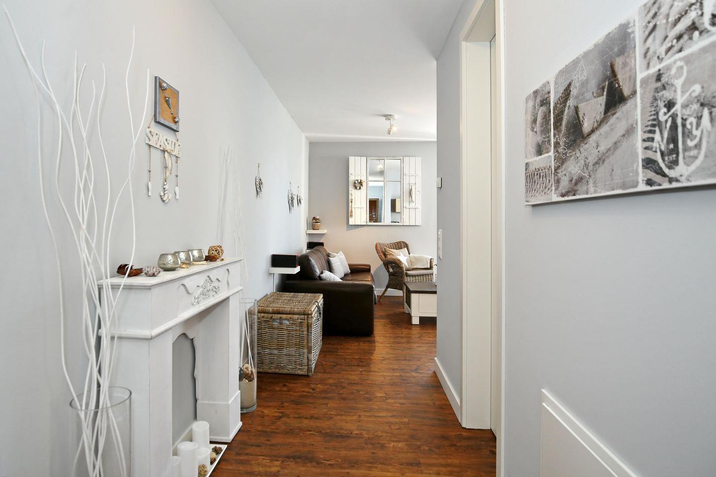 Die Ferienwohnung verfügt über ein modern gestaltetes Duschbad. Der großzügige Waschtisch bietet Ihnen viel Platz für Ihre Waschutensilien. Ein Haartrockner komplettiert die Ausstattung des Bades. Der Nassbereich ist gefliest. Im Wohn- und Schlafzimmer ist Design-Belag verlegt. In der gesamten Wohnung sorgt eine Fußbodenheizung für wohlige Wärme. In dieser Nichtraucherwohnung sind Haustiere nicht erlaubt.