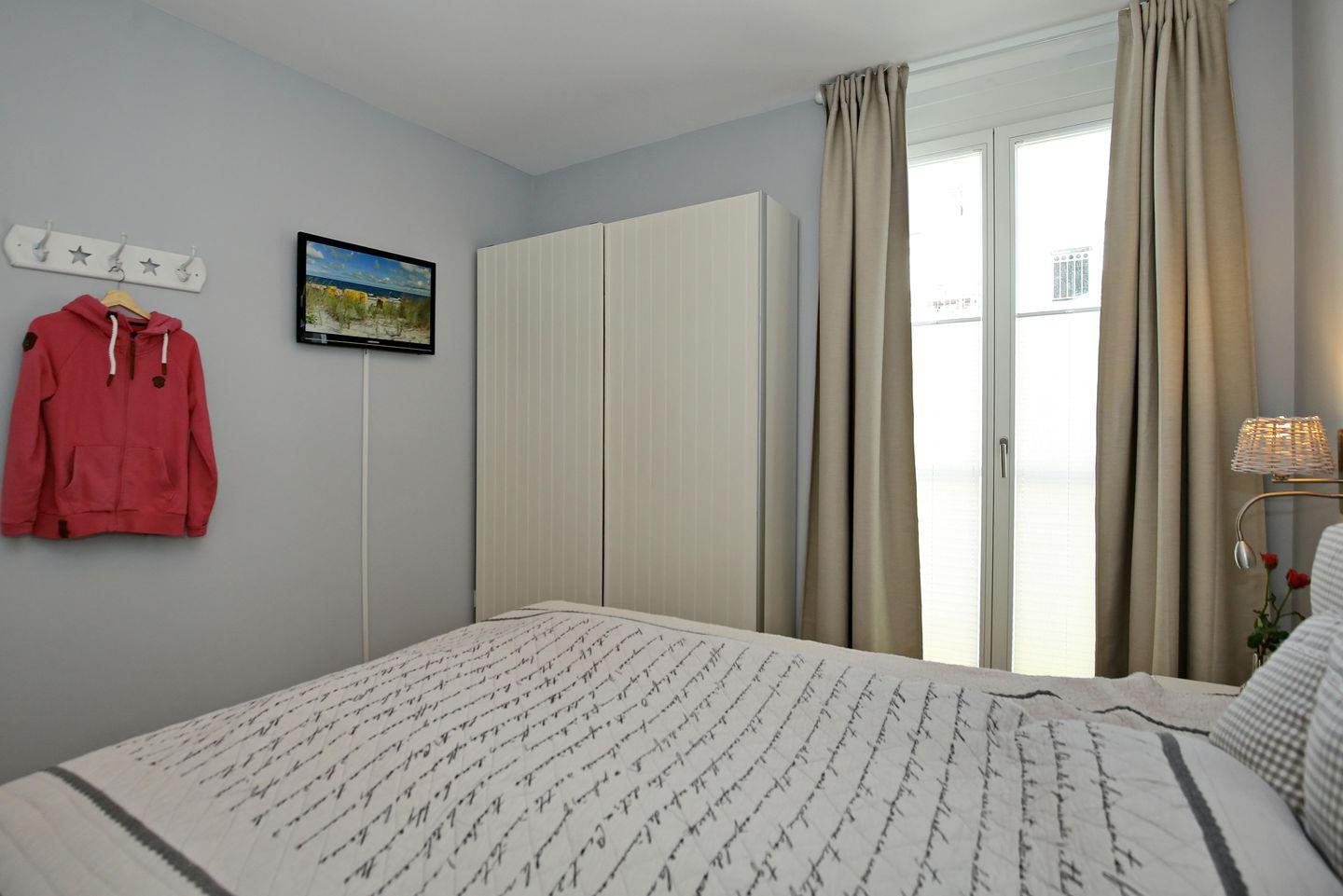 Im Schlafzimmer der Ferienwohnung empfängt Sie ein bequemes Doppelbett (2 x 80 x 200 cm). Ein großer Schiebetürenkleiderschrank sowie 2 Nachtkommoden bieten Ihnen viel Stauraum. Des Weiteren steht Ihnen auch im Schlafzimmer ein Flachbild-TV mit DVD-Player zur Verfügung. Die Schlafcouch (160 x 200 cm) im Wohnbereich wird mit wenigen Handgriffen zu einem Schlafplatz für 2 Personen.