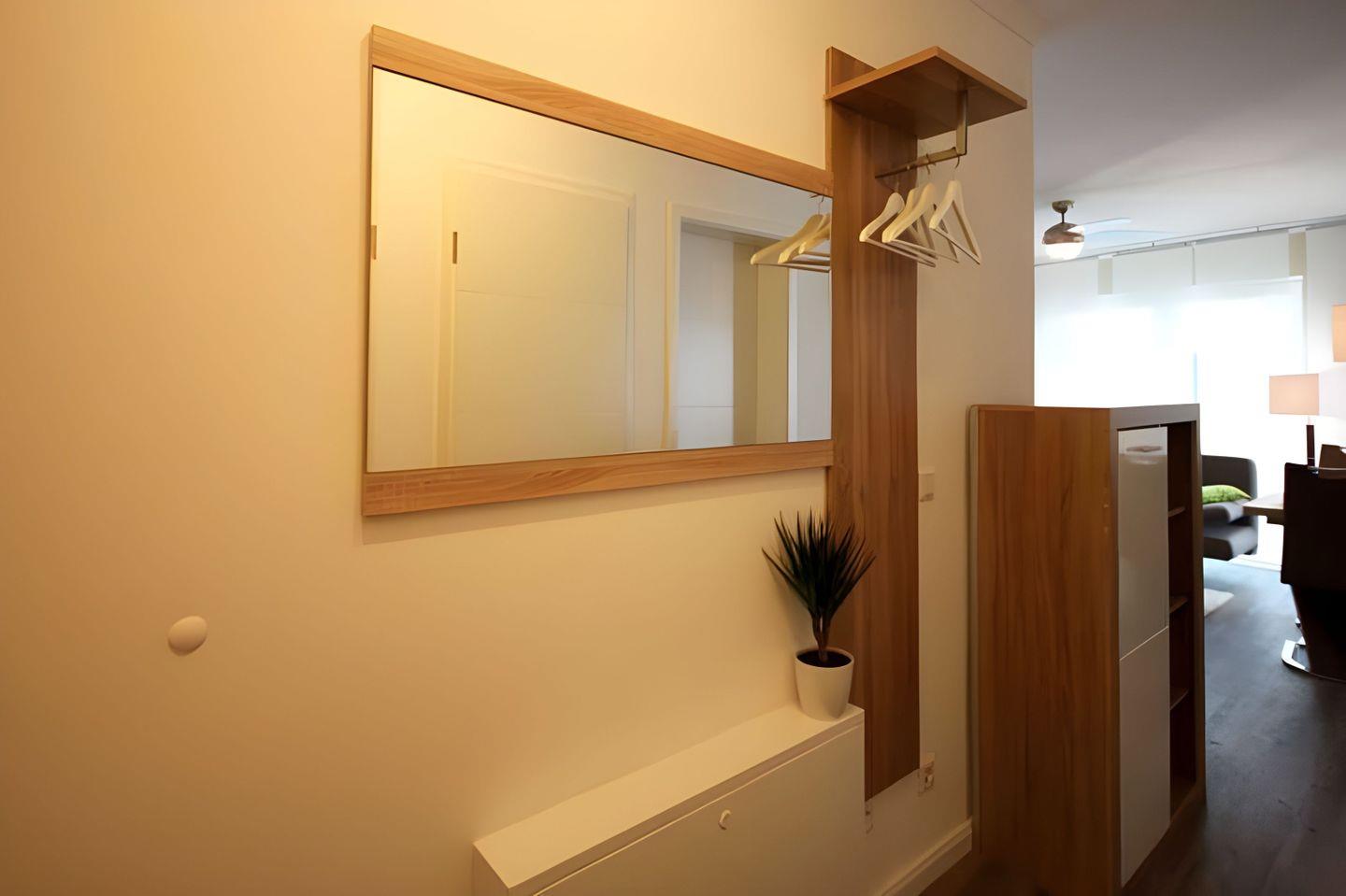 Waschtisch mit großem Spiegel und einen Fön. Zusätzlich hat die Wohnung ein