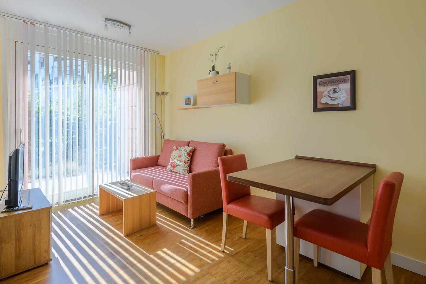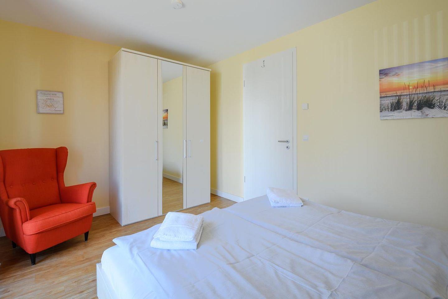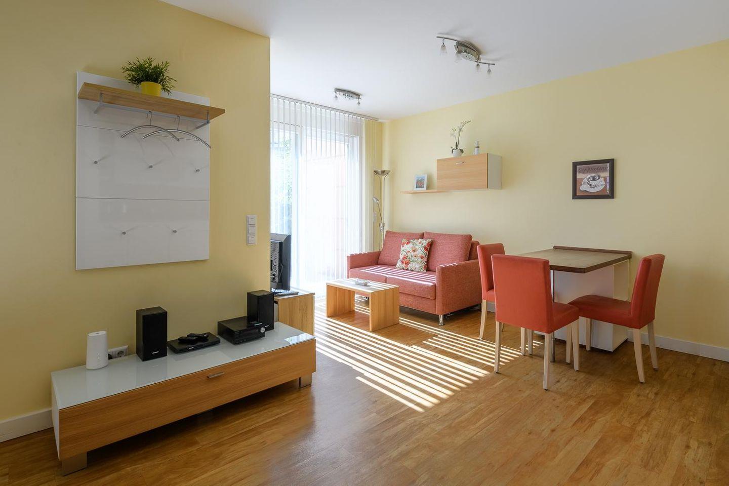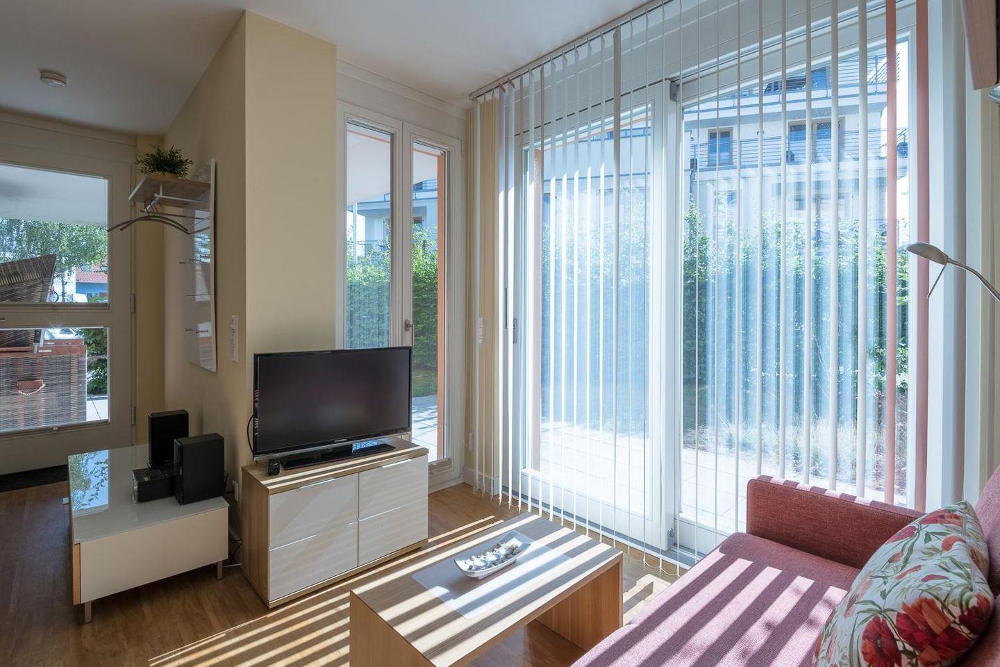 Der WOHNBEREICH hat zum Entspannen eine ausziehbare Schlafcouch. Diese kann als Schlafplatz für ein Kind genutzt werden. Natürlich gibt es ein TV-Gerät. Dazu einen DVD-Player und ein Radio. Der Wohnbereich bietet ausreichend Platz für ein Kinderreisebett. Das großzügige BAD verfügt über eine bodengleiche Dusche und einen Waschtisch mit breitem Spiegel. Auf der TERRASSE (Süd-West Ausrichtung) finden Sie einen Strandkorb (Liegestandkorb) sowie einen Tisch mit zwei Stühlen. Durch mehrere Schiebetürenfenster wird die Wohnung hell und lässt durch die Terrasse bis in den späten Nachmittag viel Licht und Sonne in den Wohnbereich. Zur Nacht kann die gesamte Wohnung durch AUSSENROLLLÄDEN verdunkelt werden.