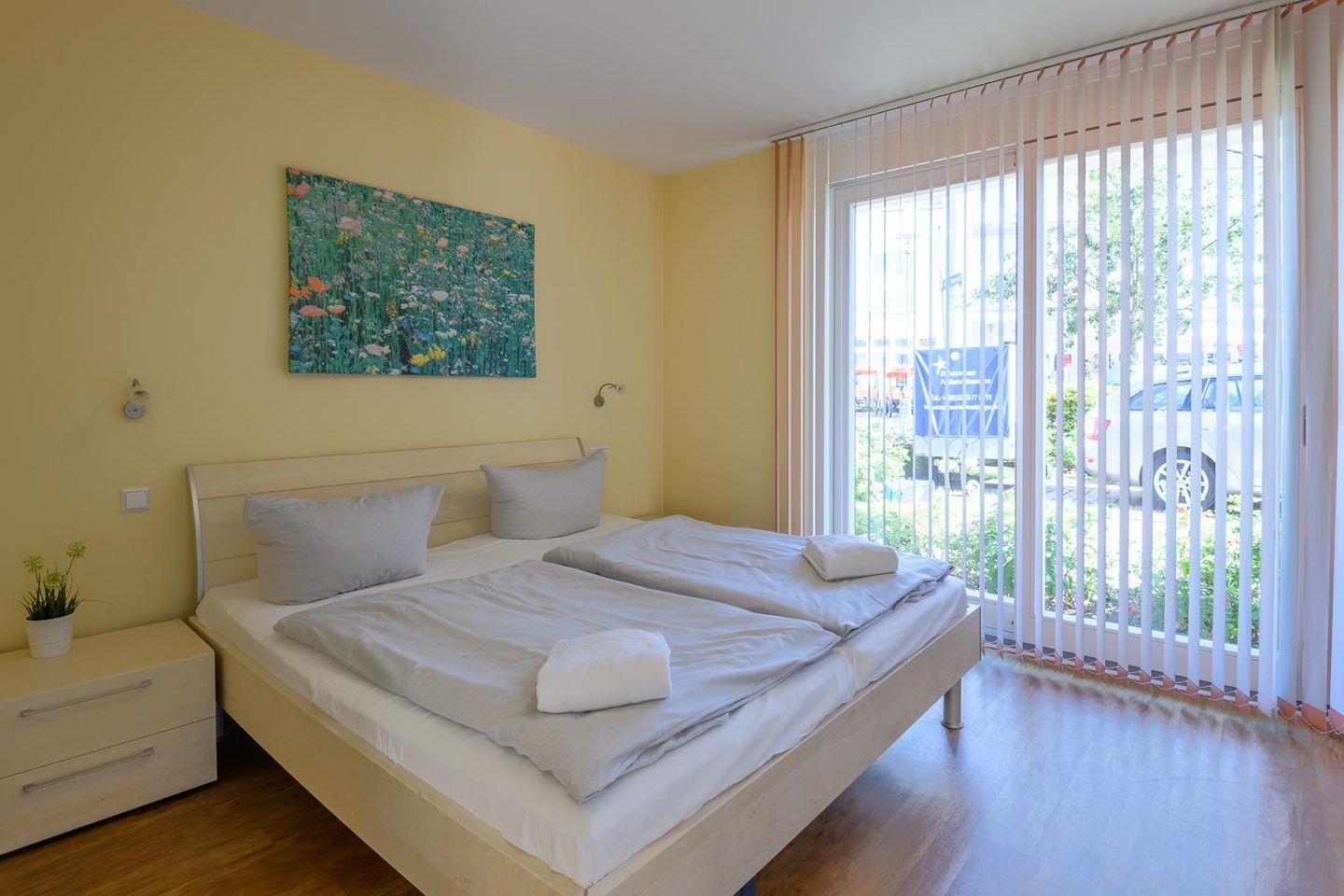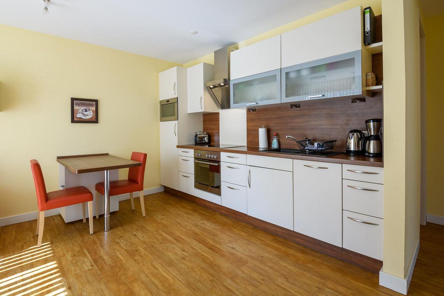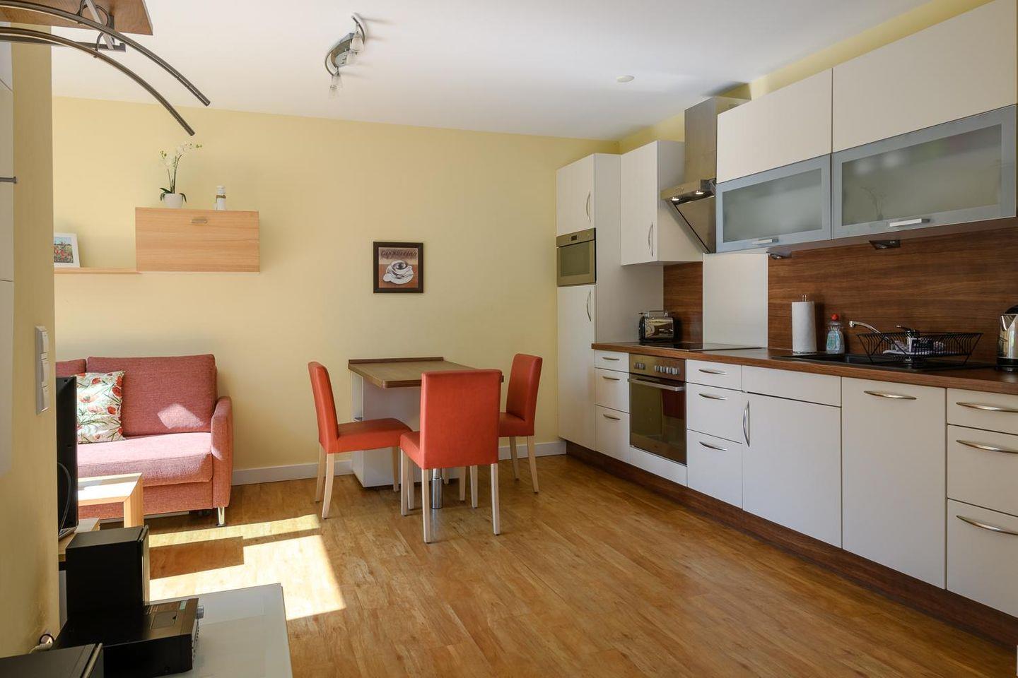 Diese Wohnung bietet Ihnen einen kombinierten ESS- UND WOHNRAUM mit direktem Zugang auf die Terrasse und hat ein geräumiges Schlafzimmer. Im SCHLAFZIMMER finden Sie ein großes Doppelbett, einen geräumigen Kleiderschrank mit Spiegel und einen Sessel. Die hochwertige KÜCHE verfügt über alles, was Sie für einen angenehmen Aufenthalt benötigen. Im Essbereich steht ein Tisch inklusive Regalteil und drei Stühlen.