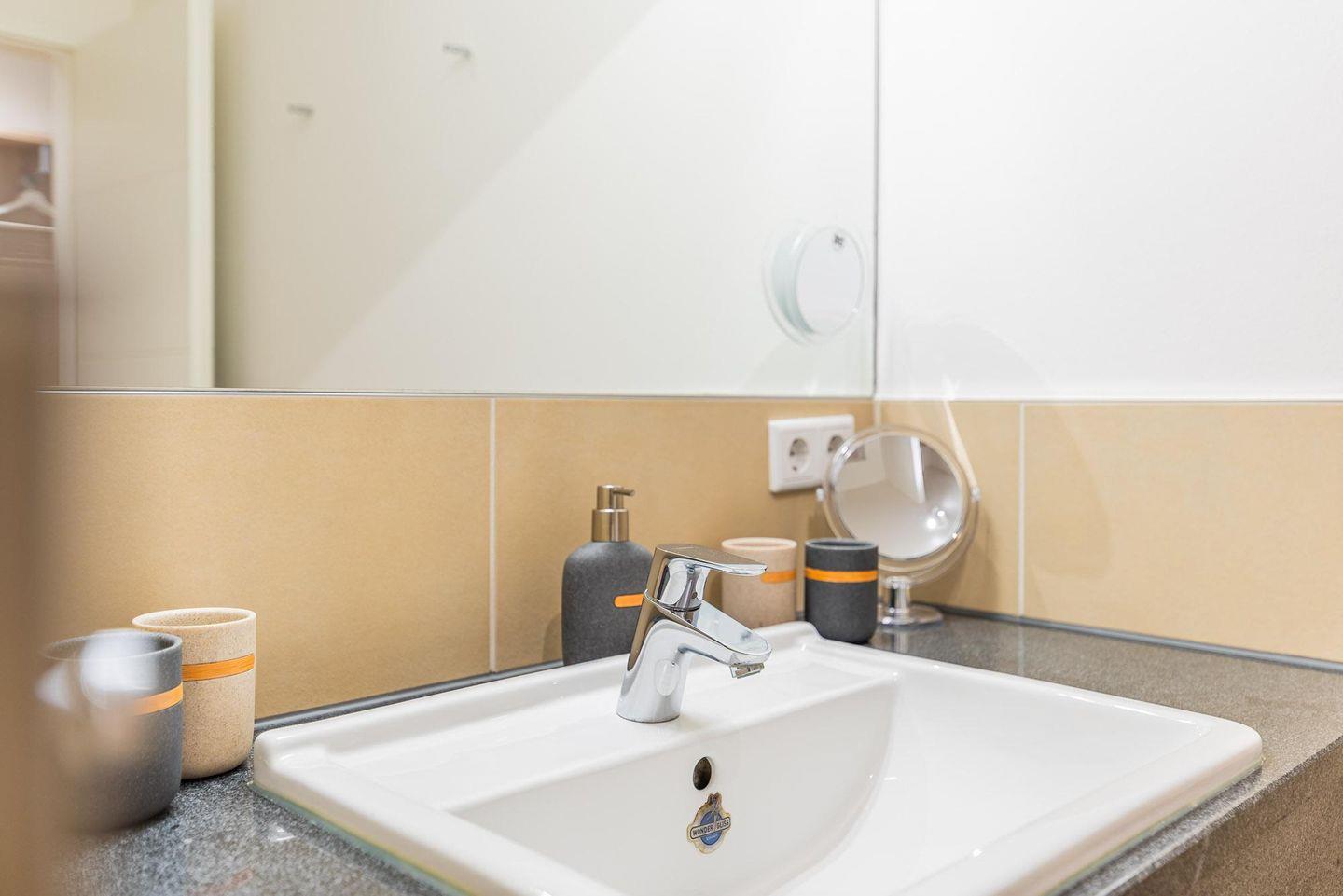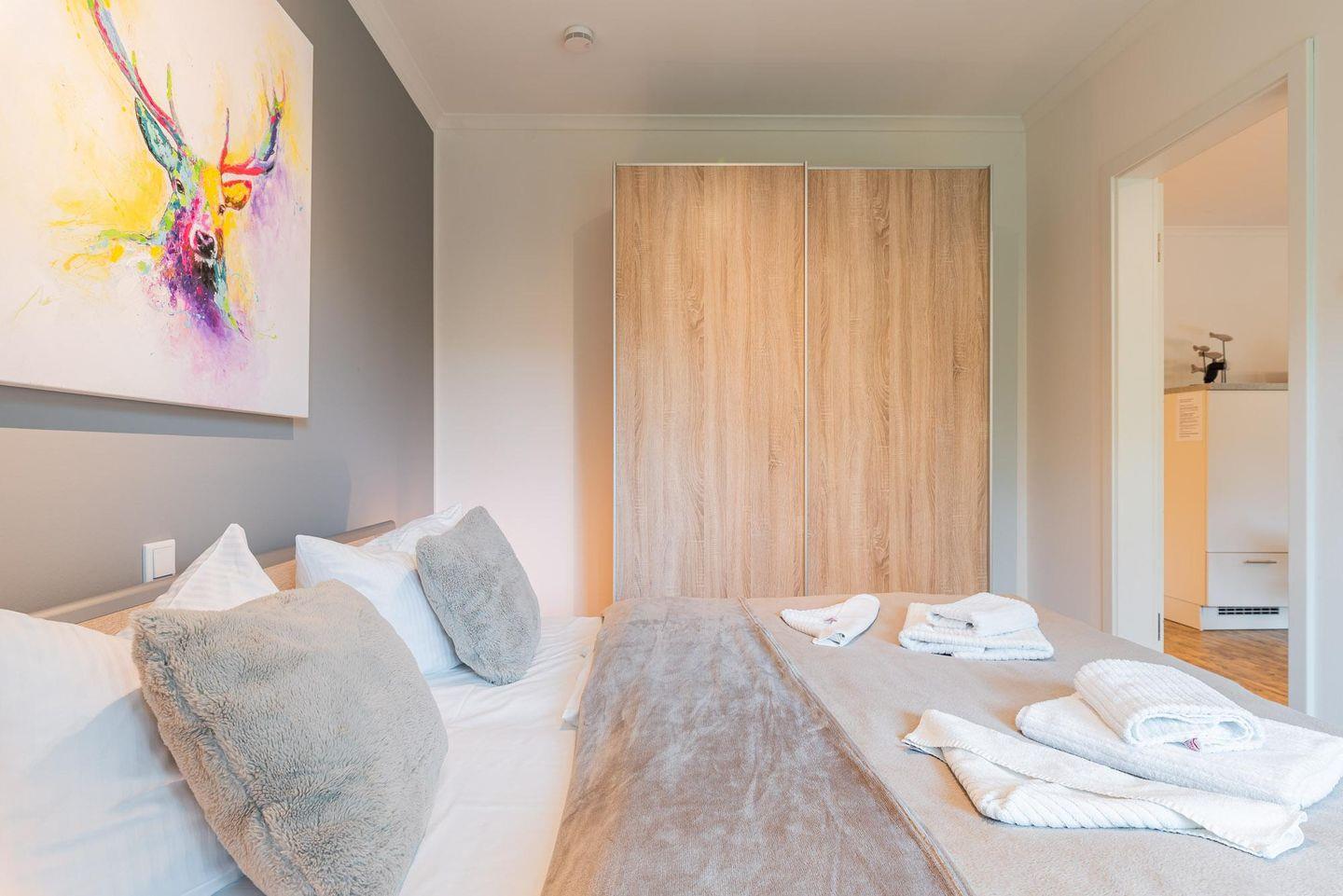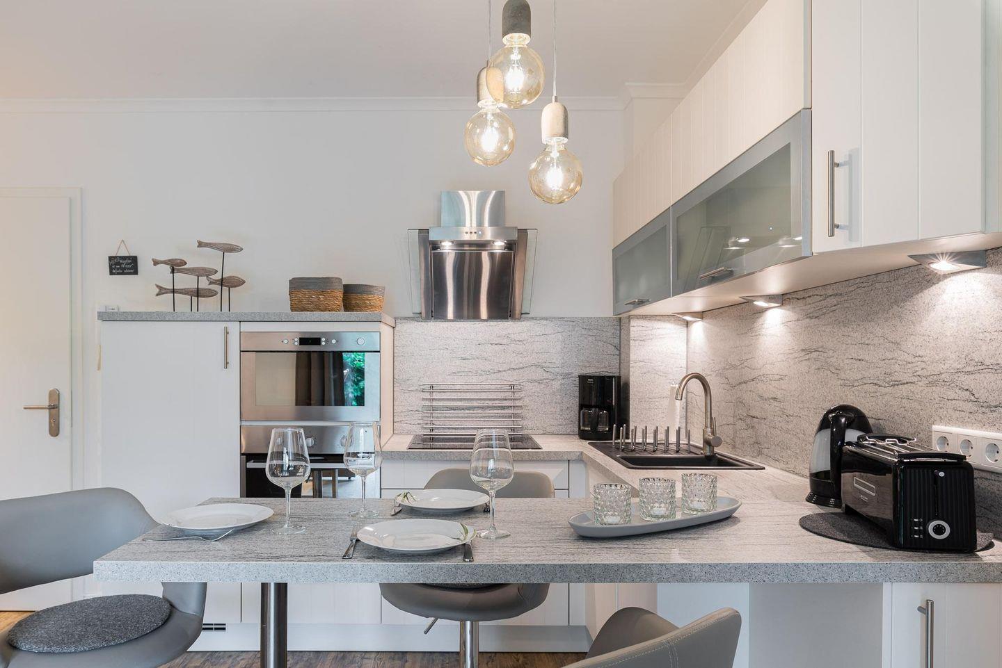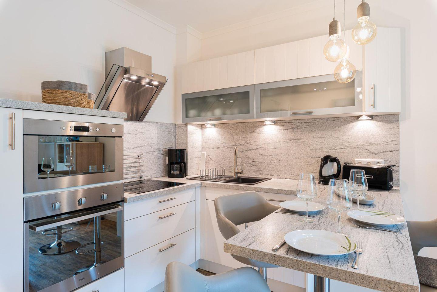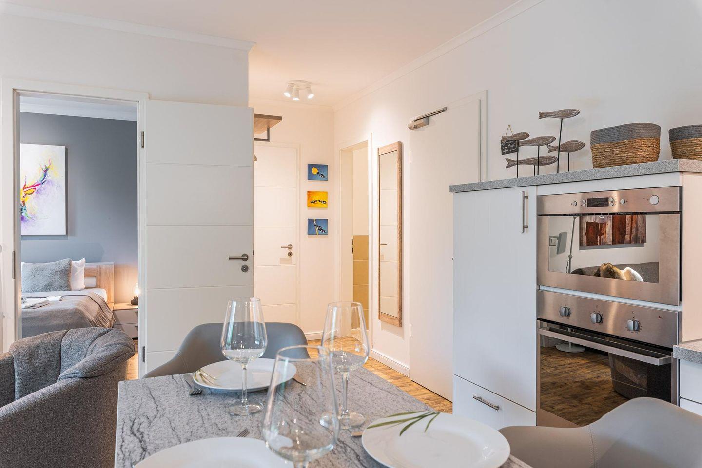 Diese moderne und gemütliche 2-Zimmerwohnung befindet sich in der Residenz Seestern. Im Wohnraum finden Sie eine hochwertige Couchgarnitur mit Schlaffunktion (1,40 x 2,00m) zum Relaxen. Zur Unterhaltung stehen Ihnen ein großer Flachbild TV, ein DVD-Player, eine Yamaha HiFi-Anlage mit Bluetooth, USB-Anschluss und CD zur Verfügung. Die voll ausgestattete Küche mit Induktionsherd, Geschirrspüler, Mikrowelle, Caffissimo - Tchibo Kaffeemaschine und weiteren Annehmlichkeiten wird Sie begeistern. Im modern eingerichteten Schlafzimmer finden Sie ein gemütliches Doppelbett (1,80 x 2,00m) mit einem geräumigen Schiebeschrank. Sowohl das Wohnzimmer als auch das Schlafzimmer haben einen direkten Zugang zur Terrasse. Das großzügige Bad mit Fußbodenheizung bietet eine bodengleiche Dusche und einen großen Waschtisch. Für Koffer und Taschen finden Sie eine separate Abstellkammer.