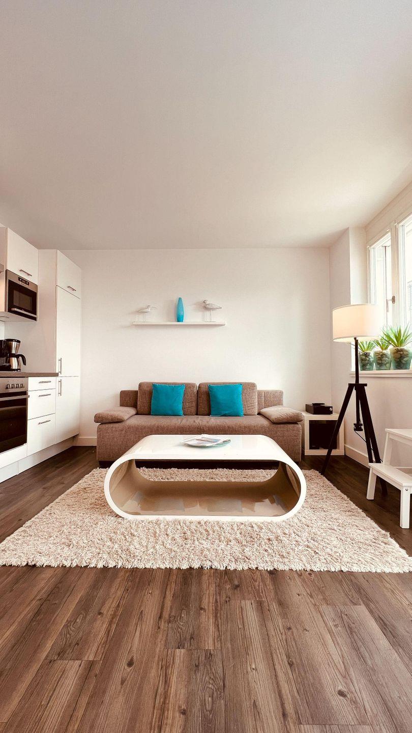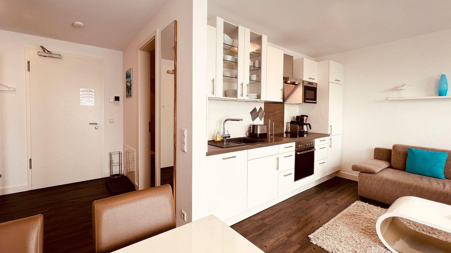 Der WOHNBEREICH dieser freundlichen Ferienwohnung wartet auf Sie mit einer angenehmen Schlafcouch (144 x 204) als Aufbettung für einen dritten und vierten Gast. Sollte mal kein Strandwetter sein, sorgen Sie mit einem TV-Gerät und einer kleinen Stereoanlage für gute Laune. Im Wohnraum befindet sich auch der Esstisch mit vier gepolsterten Stühlen. Postiert gleich neben der OFFENEN KÜCHE. Die Küche selbst beinhaltet neben der Standardausrüstung einen Herd (4x Ceranfeld), Backofen, Geschirrspüler, Mikrowelle, eine „Nespresso Maschine“ sowie einen Kühlschrank, inklusive Gefrierfach.