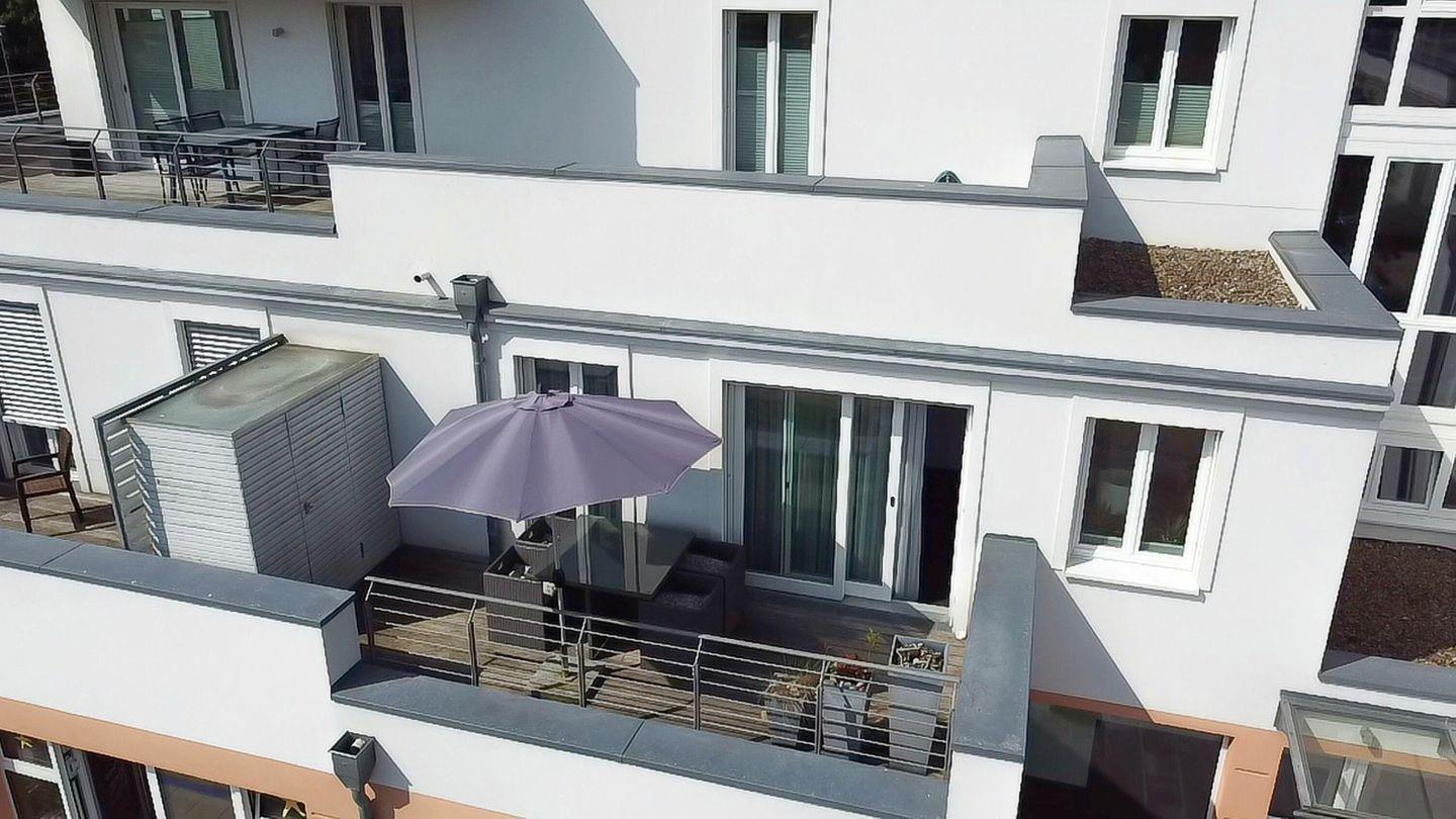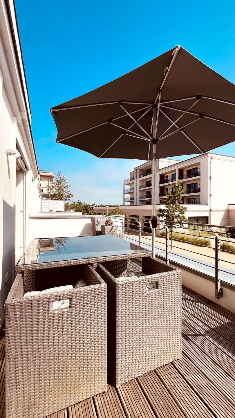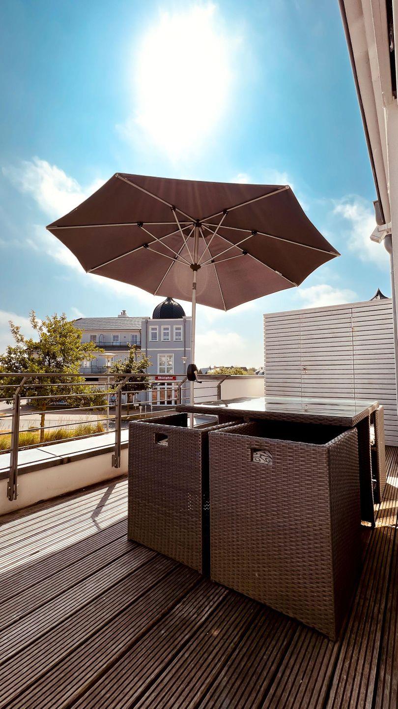 Auf den BALKON gelangen Sie sowohl vom Wohnzimmer als auch vom Schlafraum aus. Da dieser in Richtung Osten angelegt wurde, lässt sich hier ausgiebig Frühstücken. Bei Bedarf kann der installierte Sonnenschirm genutzt werden. Zu dieser Ferienwohnung gehört ebenfalls ein kostenfreier PKW- STELLPLATZ in der TIEFGARAGE des Gebäudes. Bitte beachten Sie die DURCHFAHRTSHÖHE von max. 1,90 m! Bei Überschreitung dieser maximalen Durchfahrtshöhe, besteht die Möglichkeit auf einen kostenpflichtigen Parkplatz in unmittelbarer Nähe auszuweichen. Für mitgebrachte oder auch angemietete Fahrräder steht ein ABSCHLIESSBARER FAHRRADRAUM in dieser Tiefgarage zur Verfügung. Und auch einen Aufzug, der Ihr Urlaubsgepäck in Ihre Wohnetage bringt, ist dort zu finden.