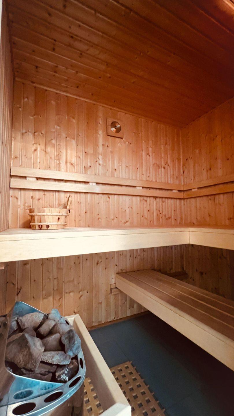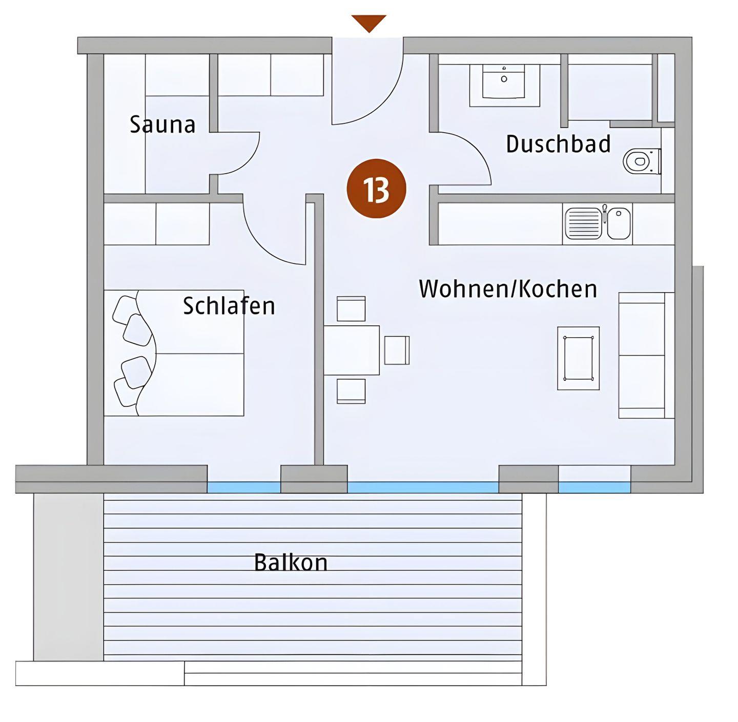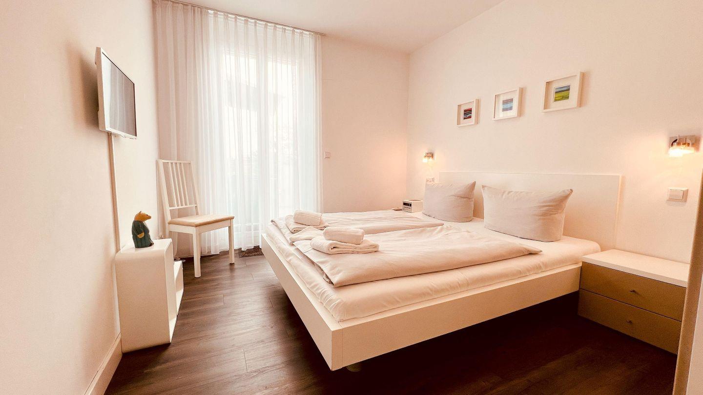 Im hellen SCHLAFRAUM steht ein Doppelbett für den entspannten Urlaubsschlaf zur Verfügung. Ein wandmontiertes-TV Gerät und ein Bluetooth-Radio mit CD-Player am Bett, erleichtern das Aufstehen im Urlaub. Als Stauraum steht eine Kofferablage zur Verfügung. Für die Urlaubshygiene ist das moderne DUSCHBAD entsprechend eingerichtet worden. Neben der fußbodengleichen Dusche gibt es einen Handtuchtrockner, einen Föhn, eine in die Wand integrierte Ablage und natürlich einen komfortablen Waschtisch mit großem beleuchtetem Spiegel. Wie der Schlafraum auch, ist der Zugang zur SAUNA über den Flur- Wohnbereich möglich. In dieser Ferienwohnung ist die Entspannung in der Sauna kostenlos.