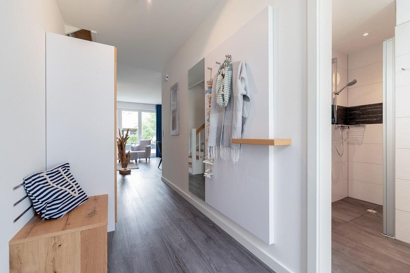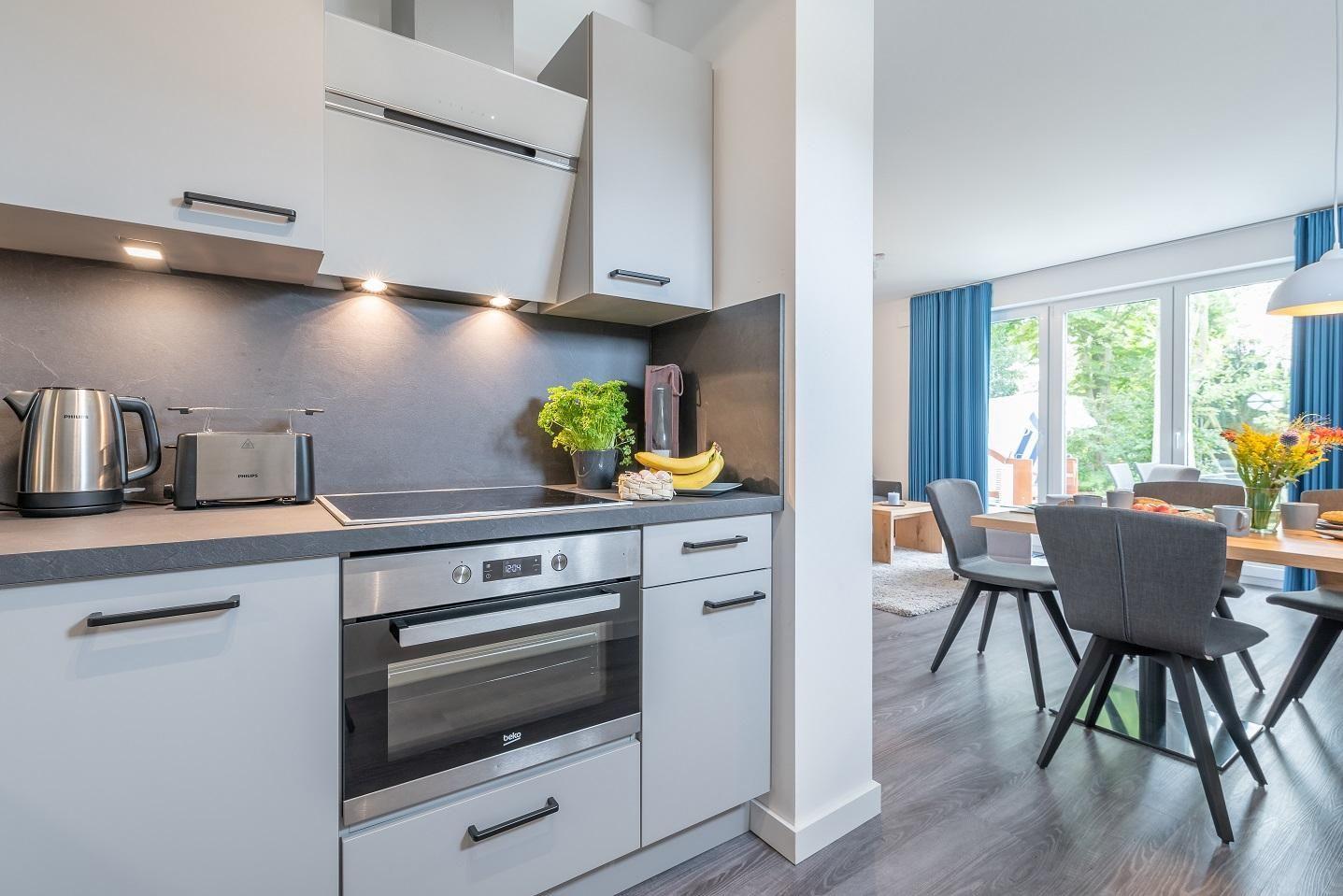 Essbereich mit offener Küche. Das Bad besticht mit ebenerdiger Dusche, Föhn und