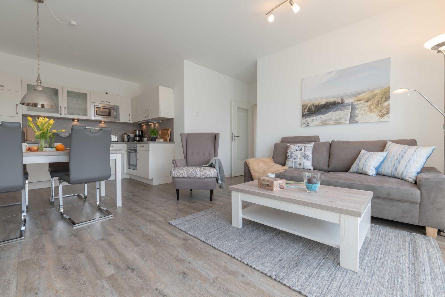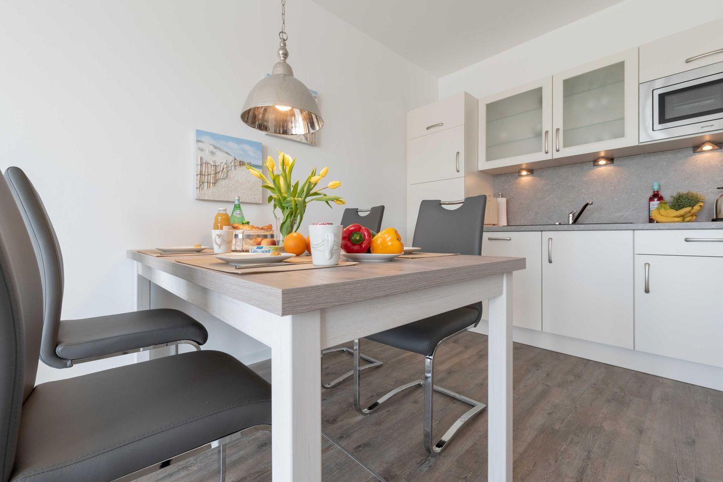 Die Wohnung verfügt über einen Wohn-/Essbereich mit integrierter Küchenzeile