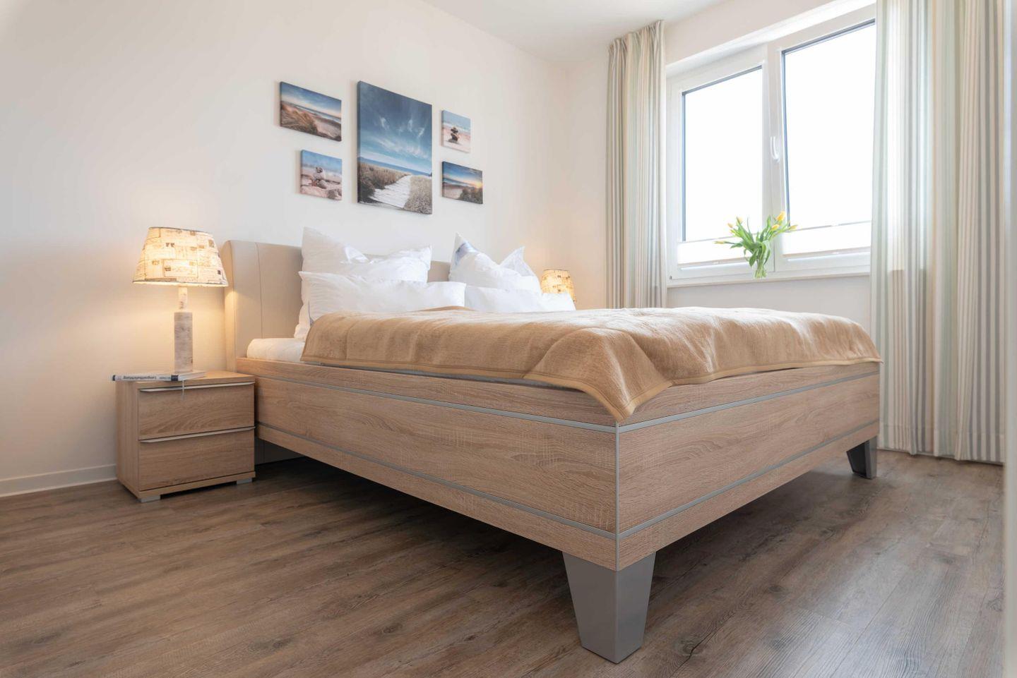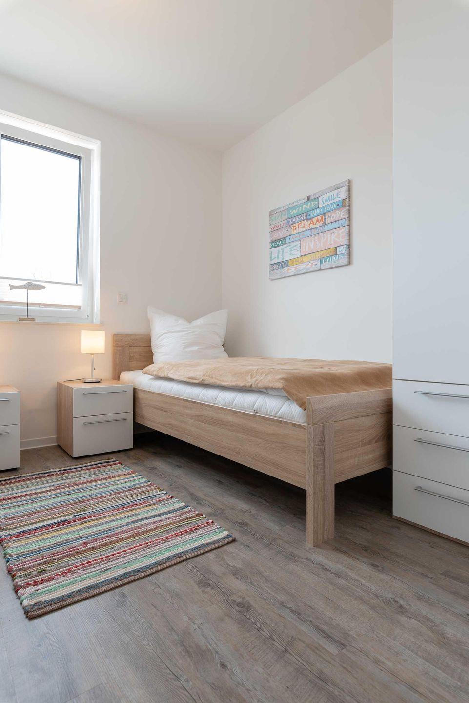 Doppelbett (180 x 200 cm) und zwei Einzelbetten (je 100 x 200 cm). Im