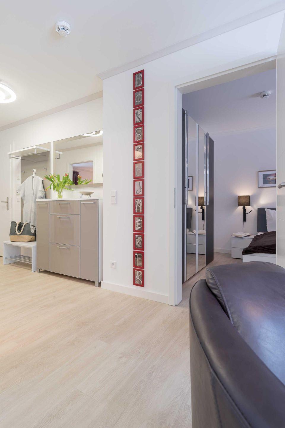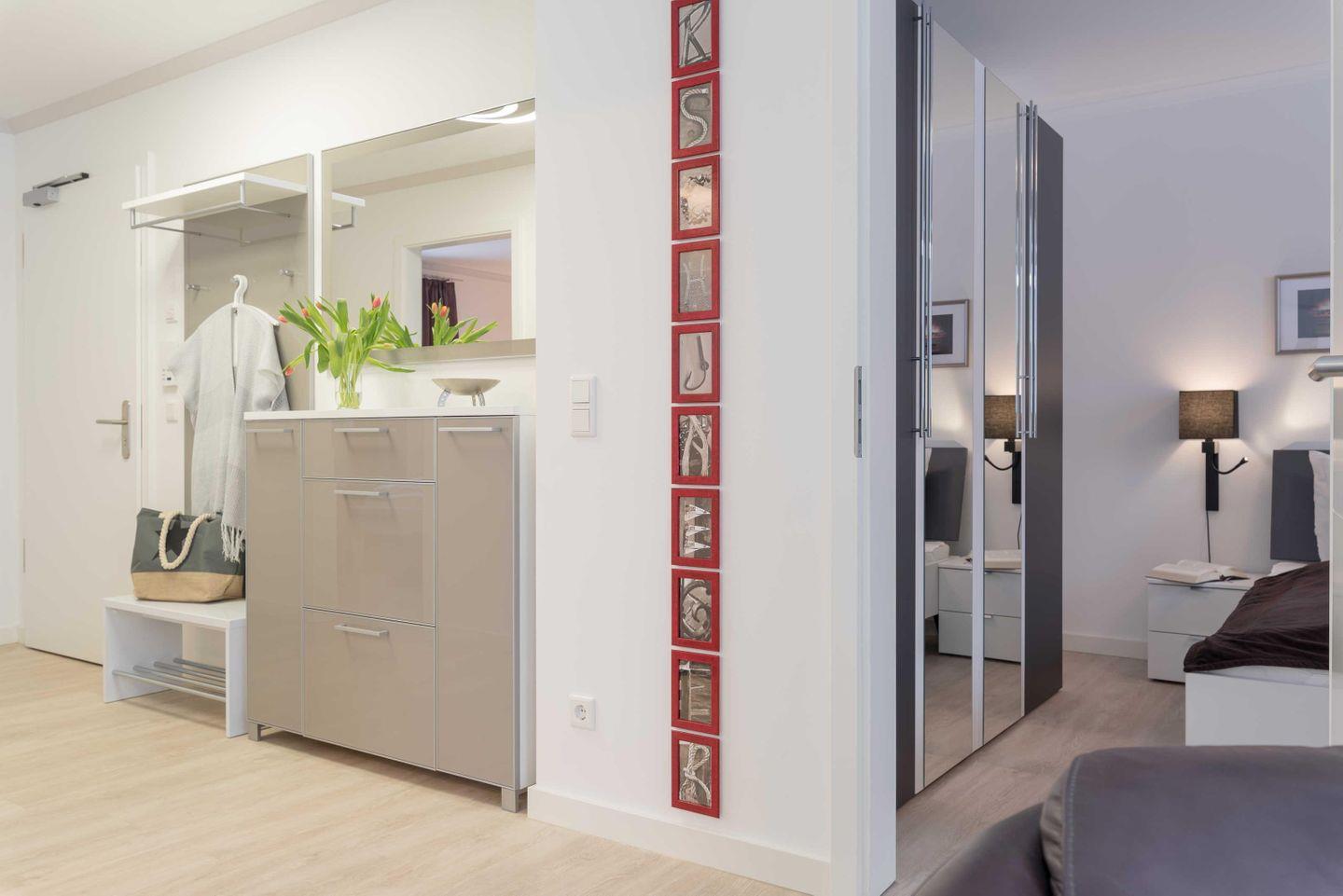 In dem geräumigen Flur steht neben der Garderobe ein Schrank mit einer kleinen