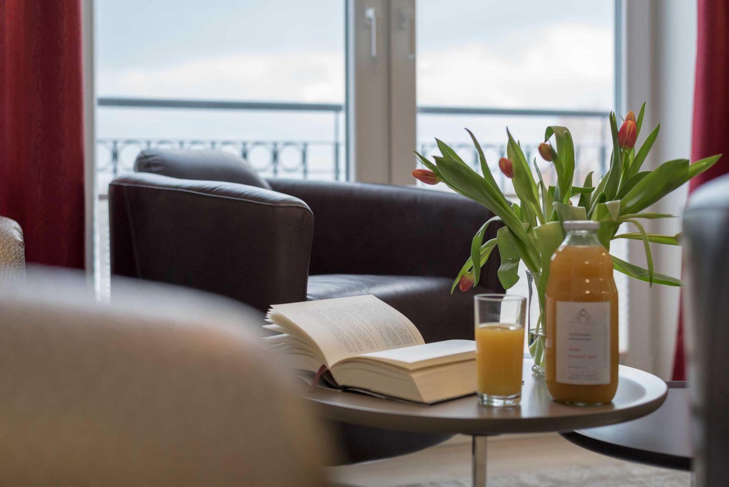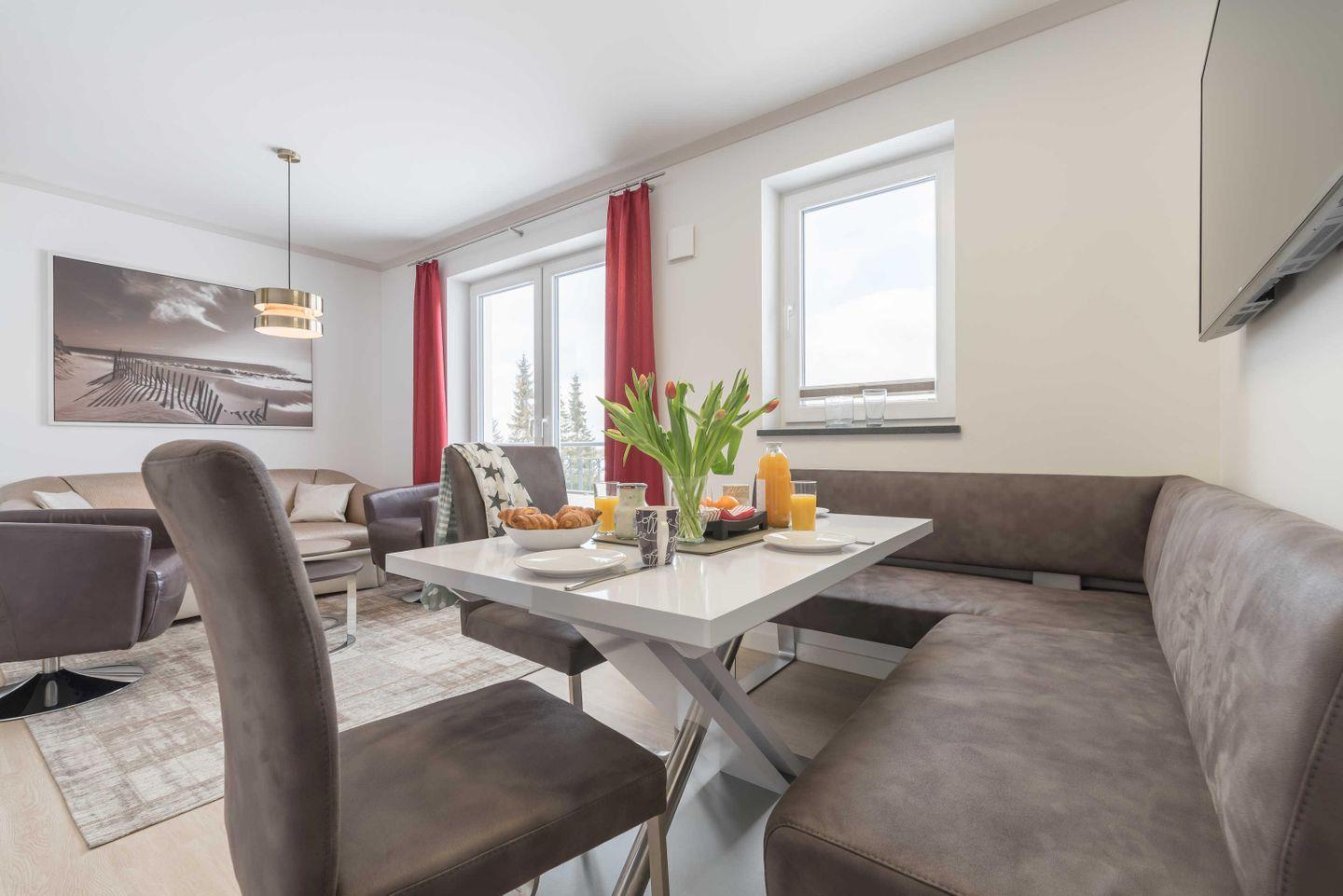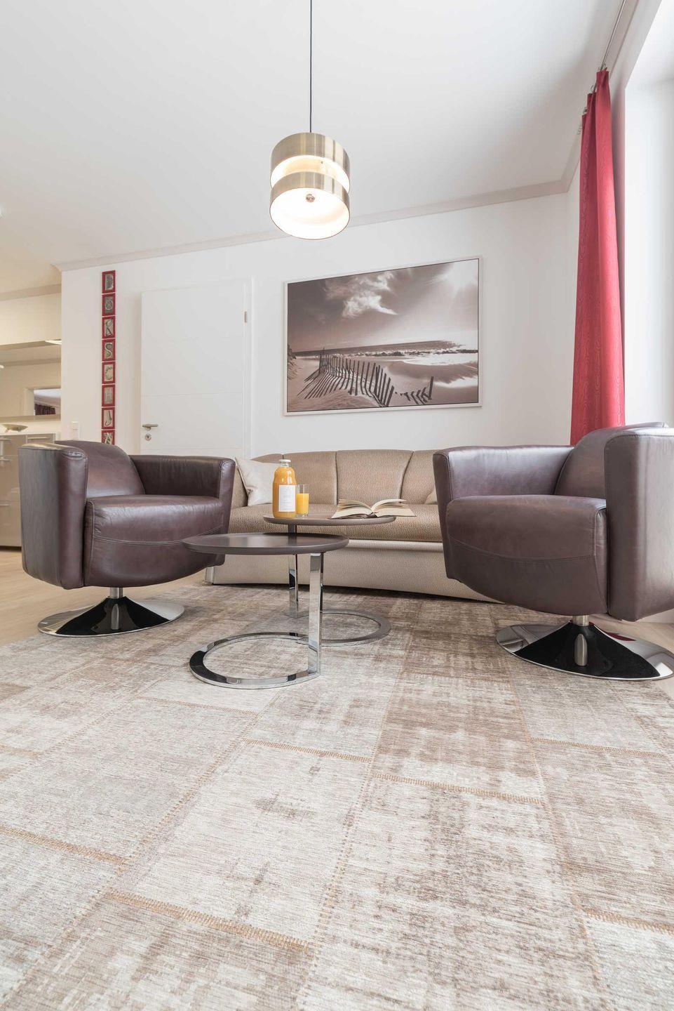 und zwei gemütliche Drehsessel. Ein großer Flat Screen-TV ist an der