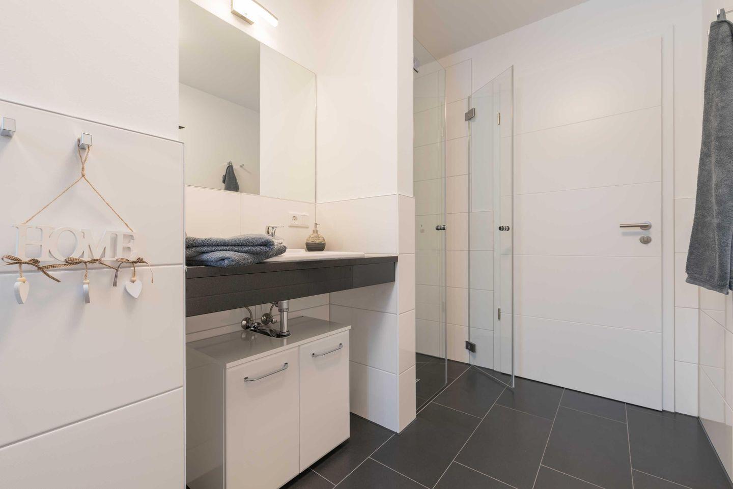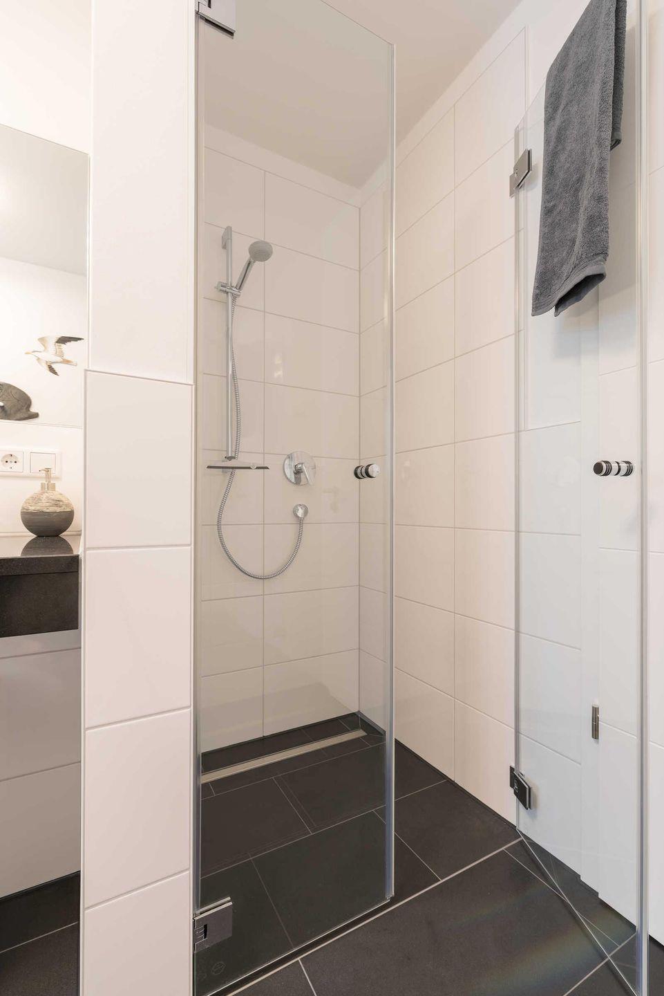 Das Bad ist mit einer ebenerdigen Dusche, einem beleuchteten Wandspiegel und