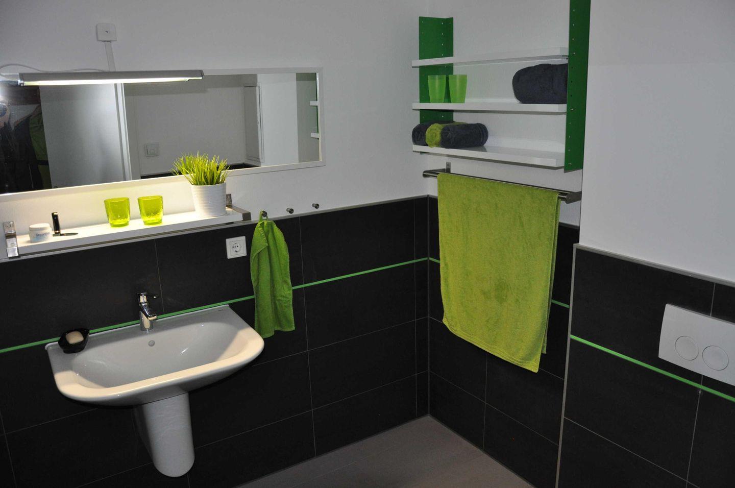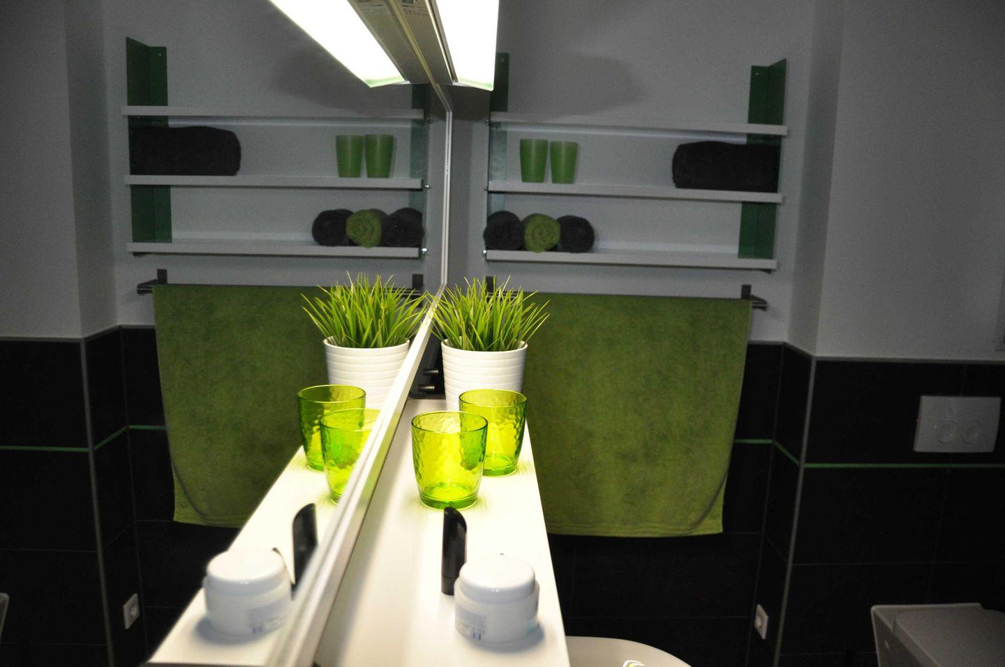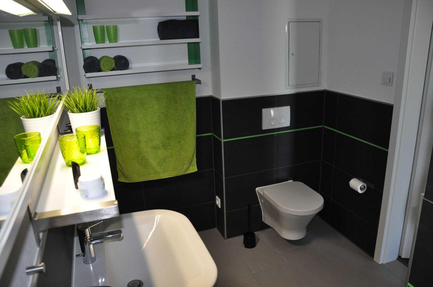 Geschirrspüler, Mikrowelle, Wasserkocher, Kaffeemaschine und Toaster. Das Bad