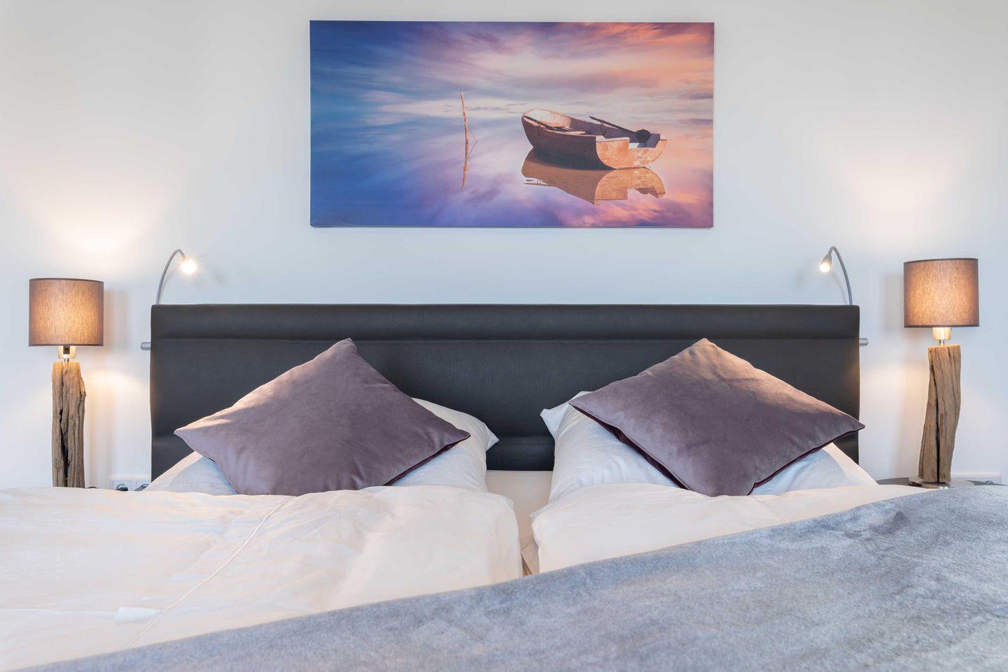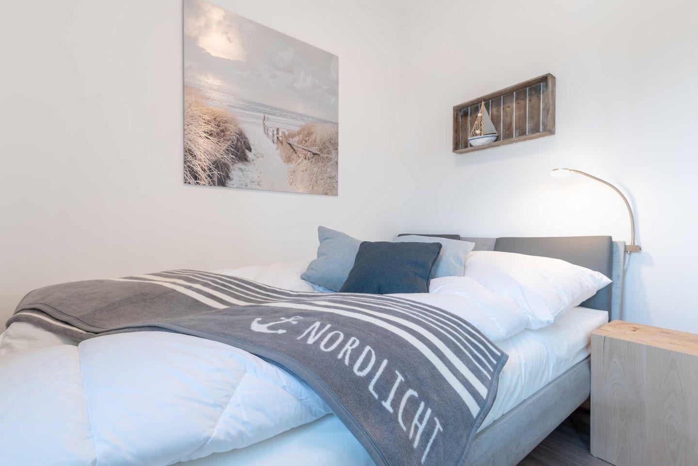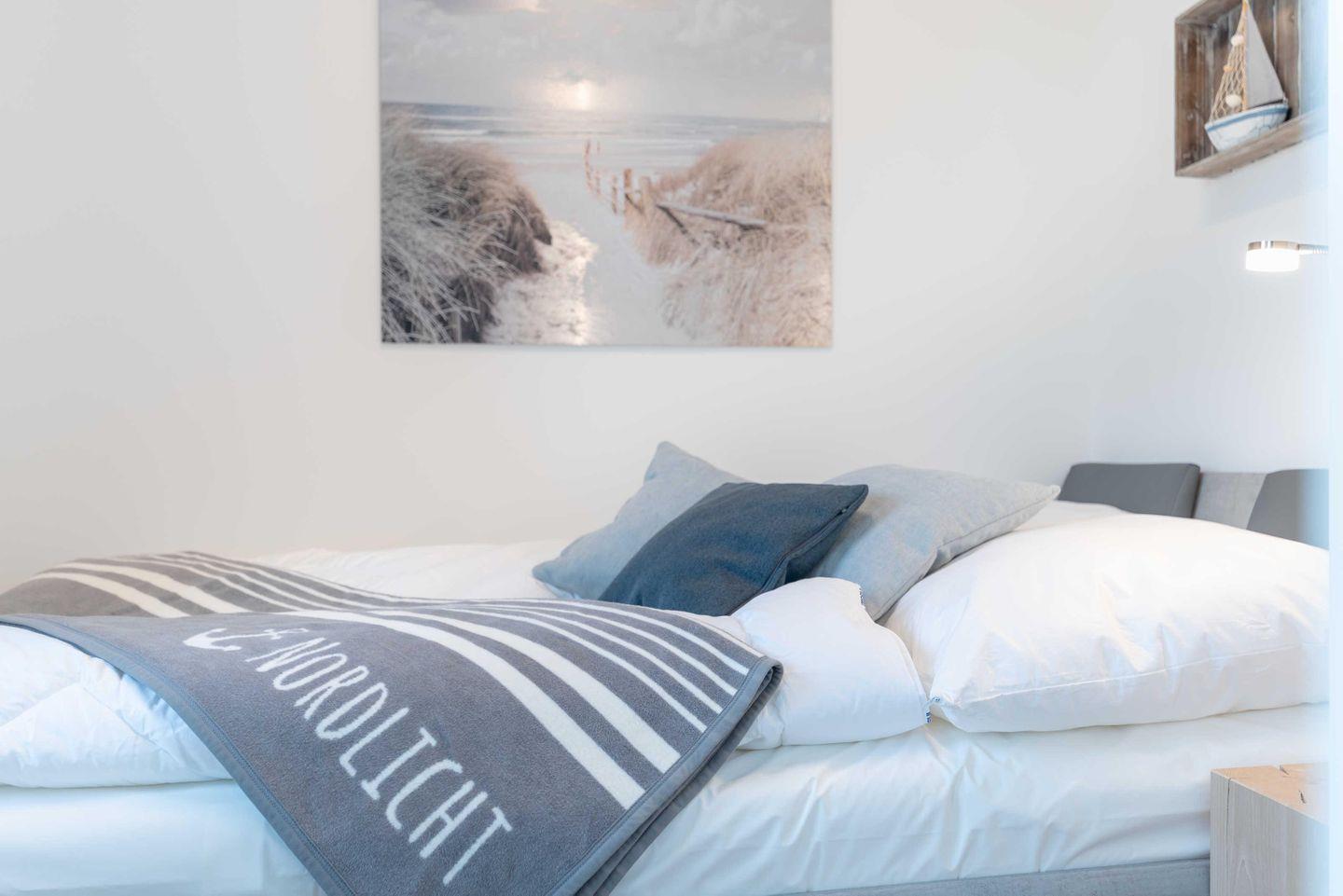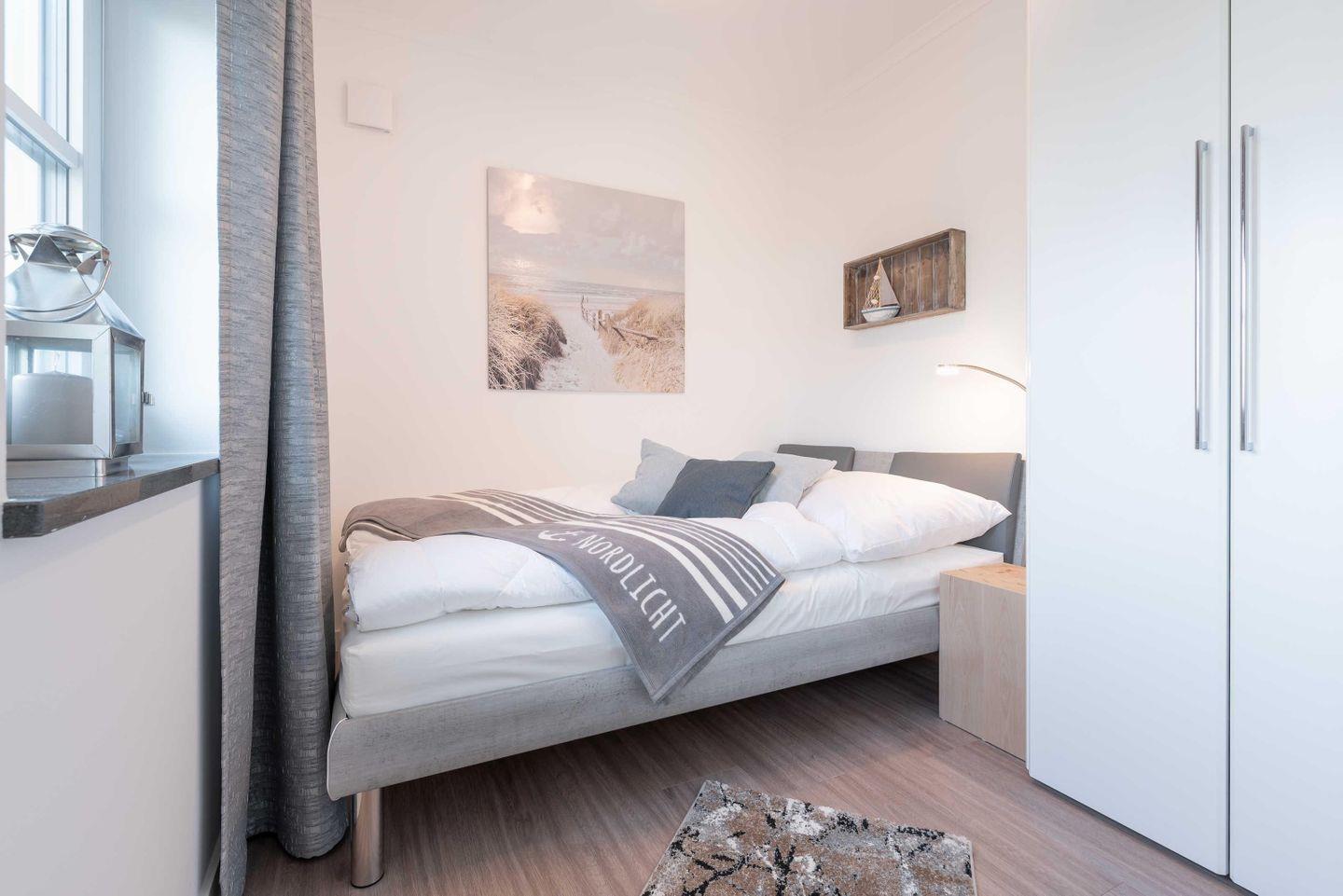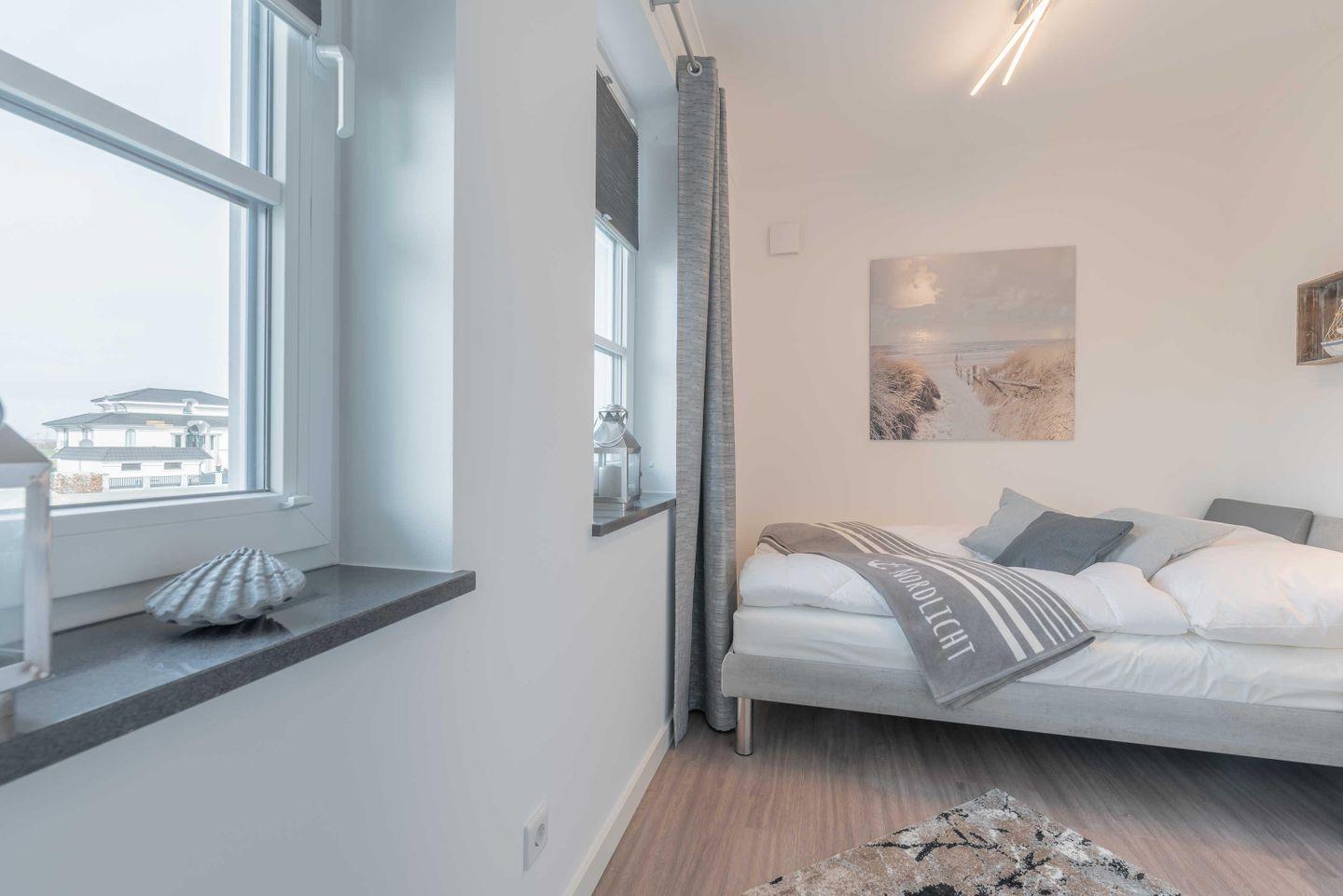 Schlafzimmer sind mit Verdunklungsplissees ausgestattet. Das Bad ist besticht