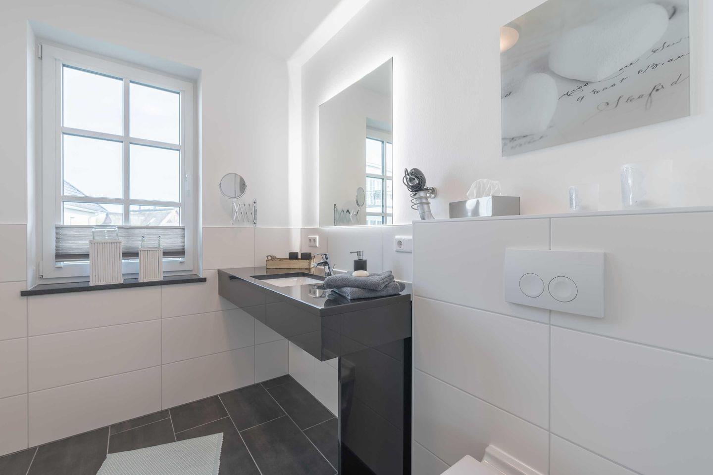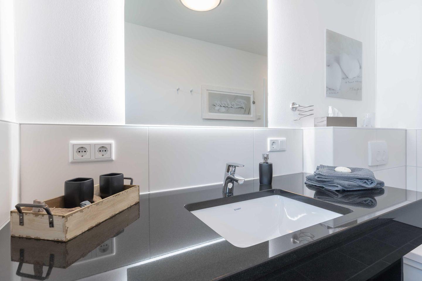 einem Waschtisch mit großem Spiegel, Ablage und Fön. Vom Wohnraum aus haben Sie
