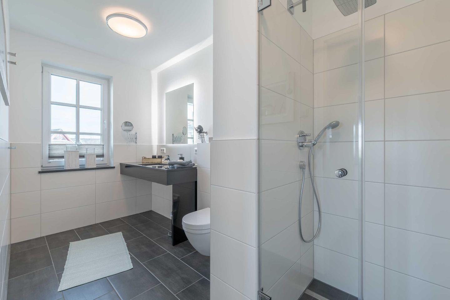 mit einer bodengleichen Dusche mit Regenbrause, einem Handtuchheizkörper und