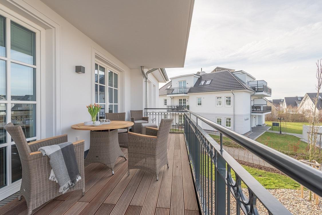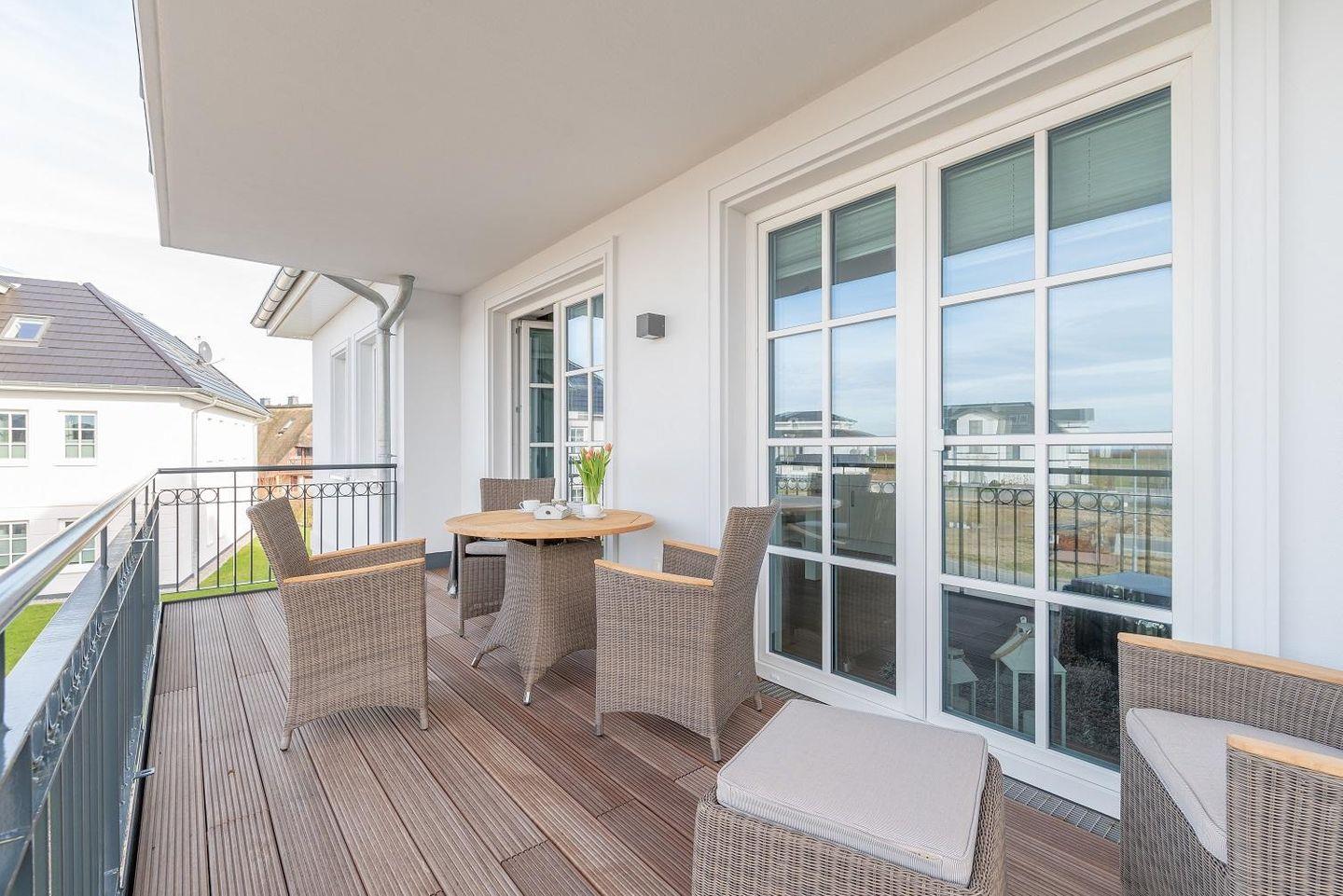 Zugang zum großzügigen Balkon mit Tisch und vier Stühlen. Von hier aus können