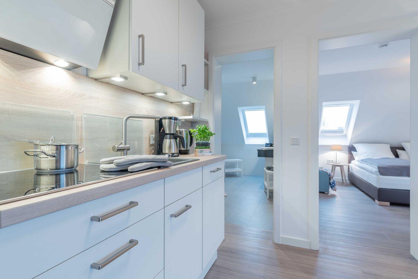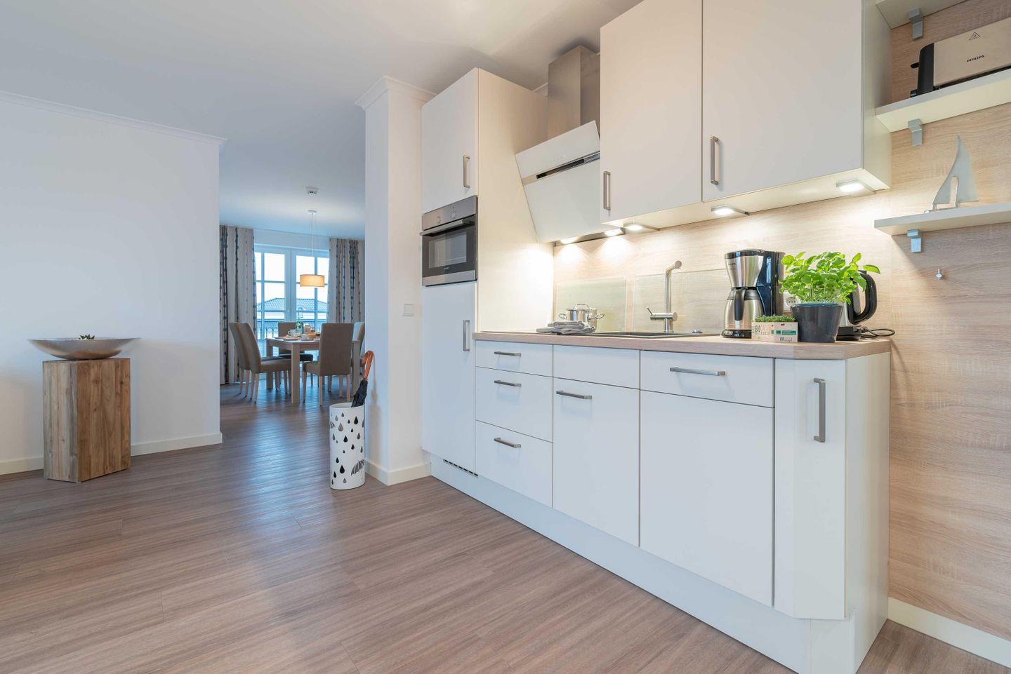 über ein Vier-Feld-Cerankochfeld, einen Backofen, einen Geschirrspüler, einen