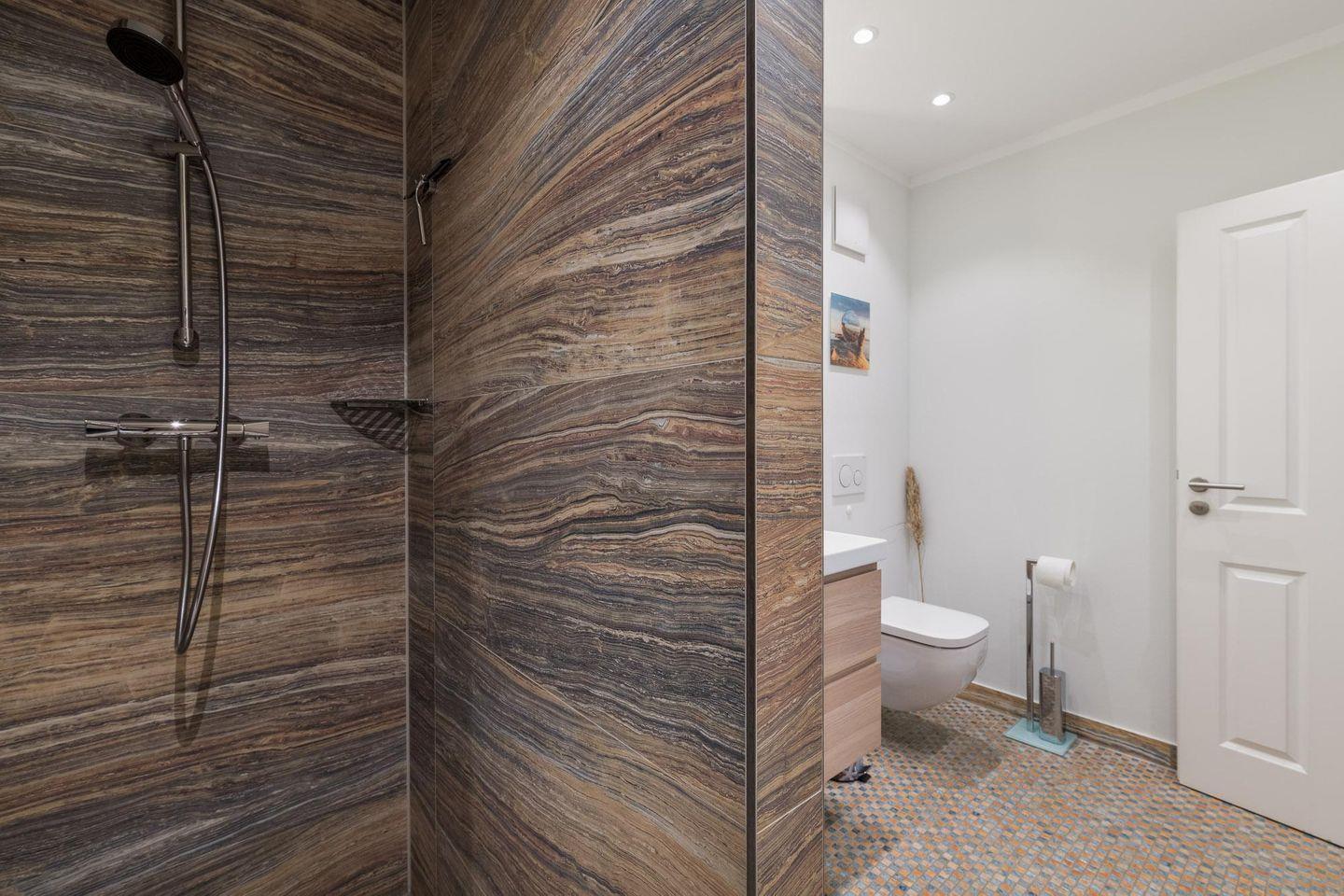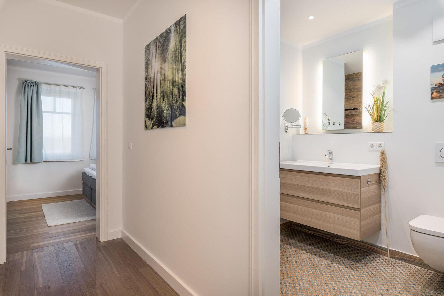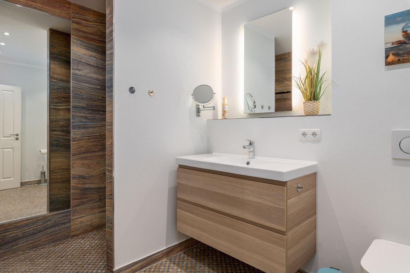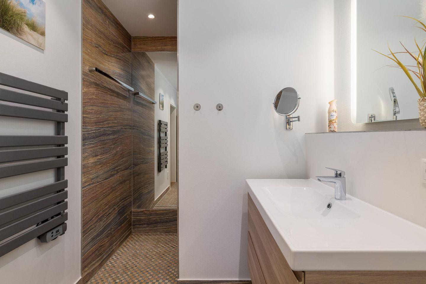 Matratze). Das moderne Bad verfügt über eine ebenerdige Dusche, einen Waschtisch