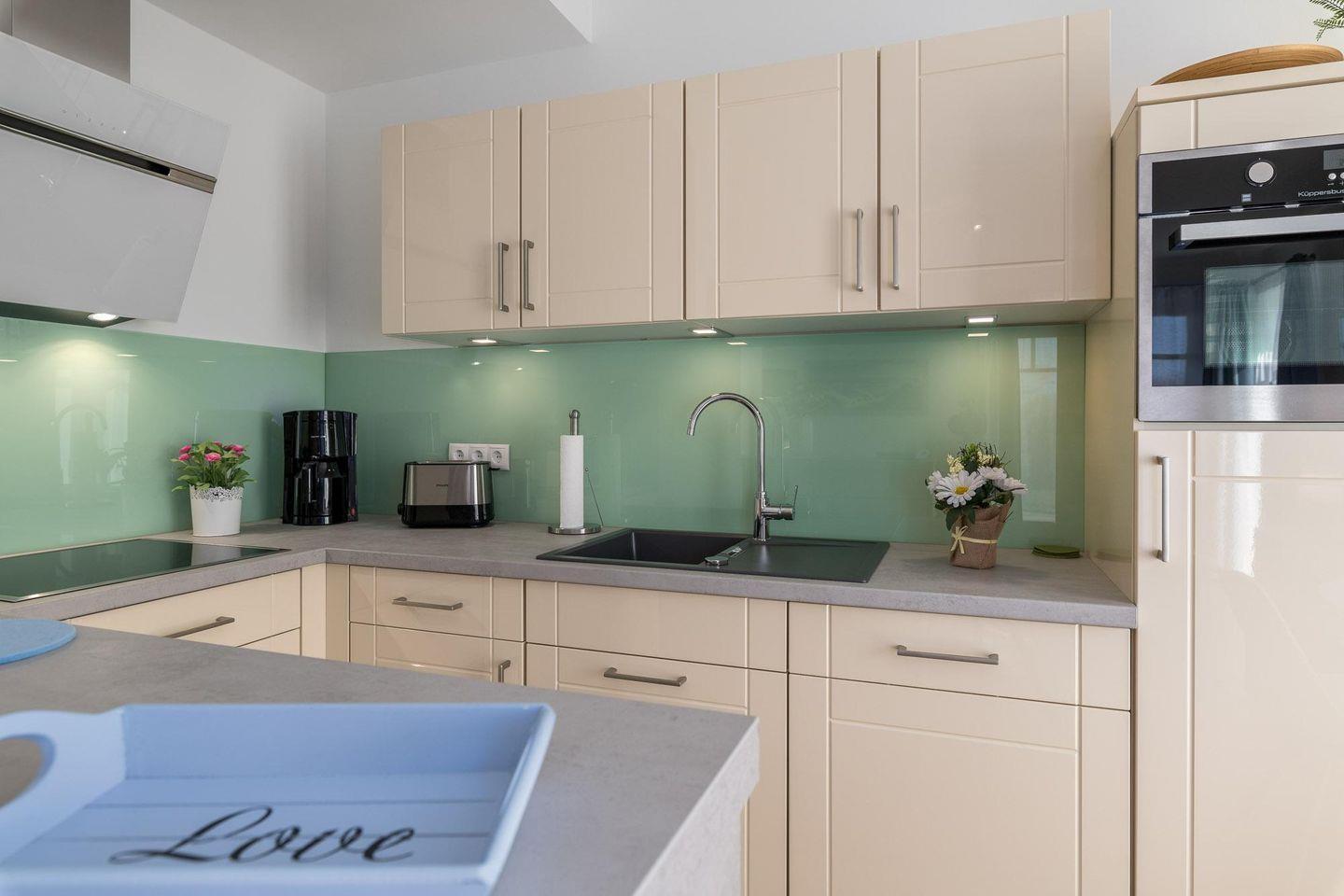 ein. Die Küche ist komplett mit modernen Geräten ausgestattet: Backofen, Herd,