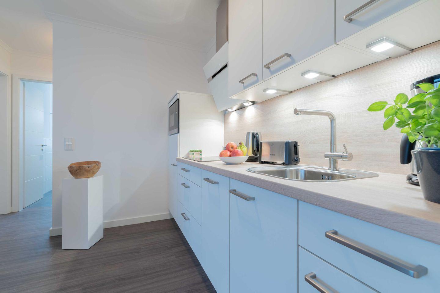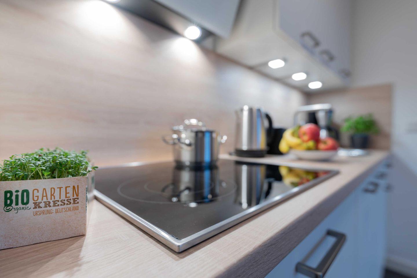 eingerichtete Einbauküche verfügt über einen Kühlschrank mit Tiefkühlfach,