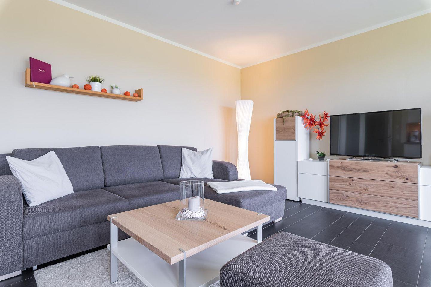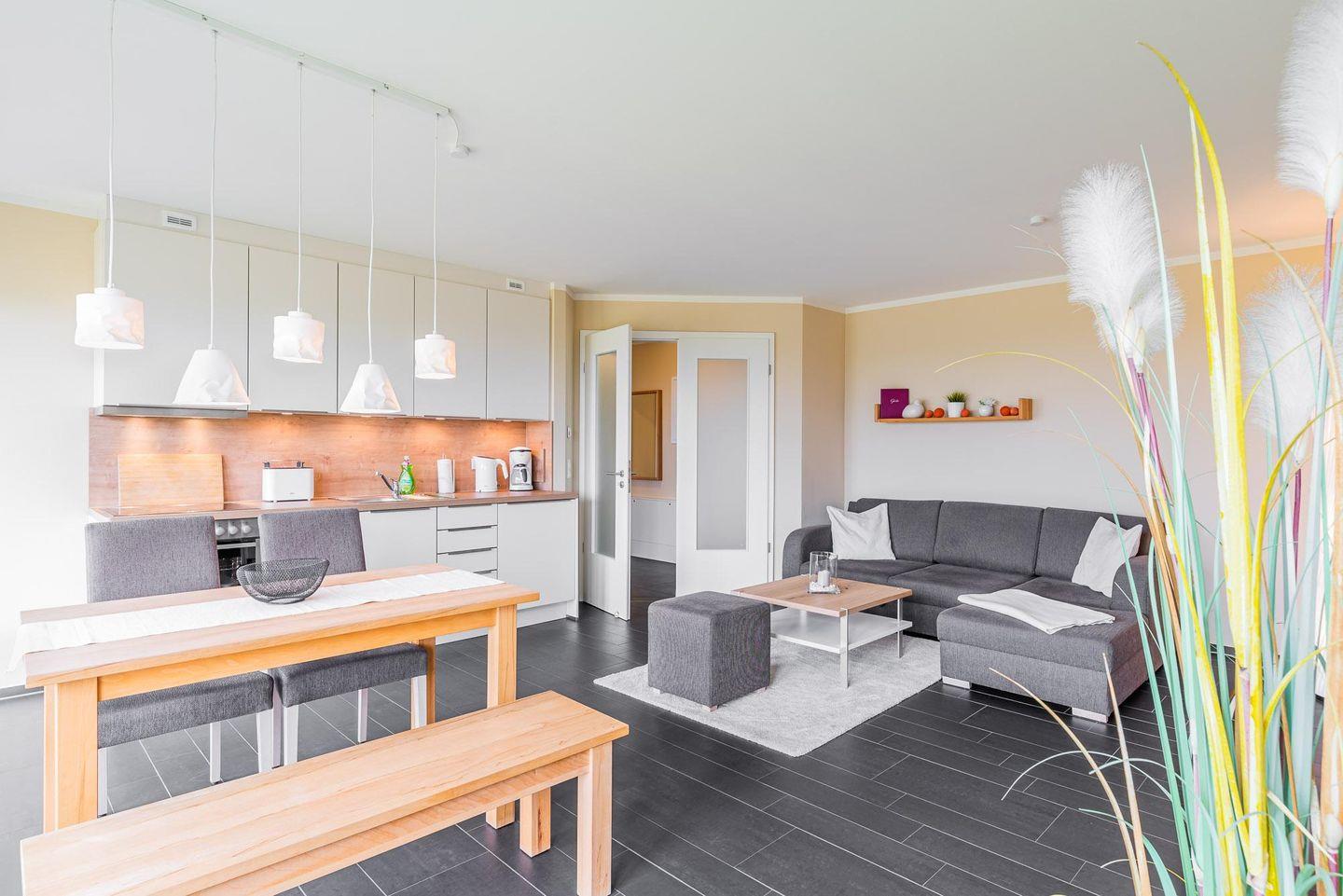 Fernseher im offenen Wohn- und Kochbereich lädt zu erholsamen Abenden und zum
