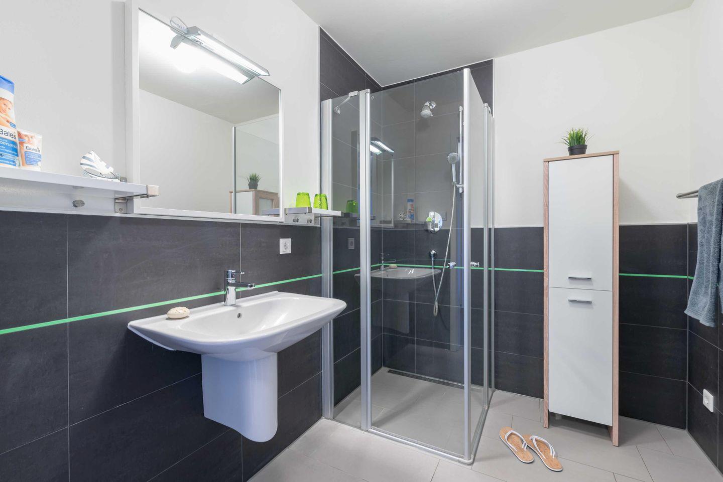 ebene Dusche sowie ein großer Spiegel und ein Haartrockner für die perfekte
