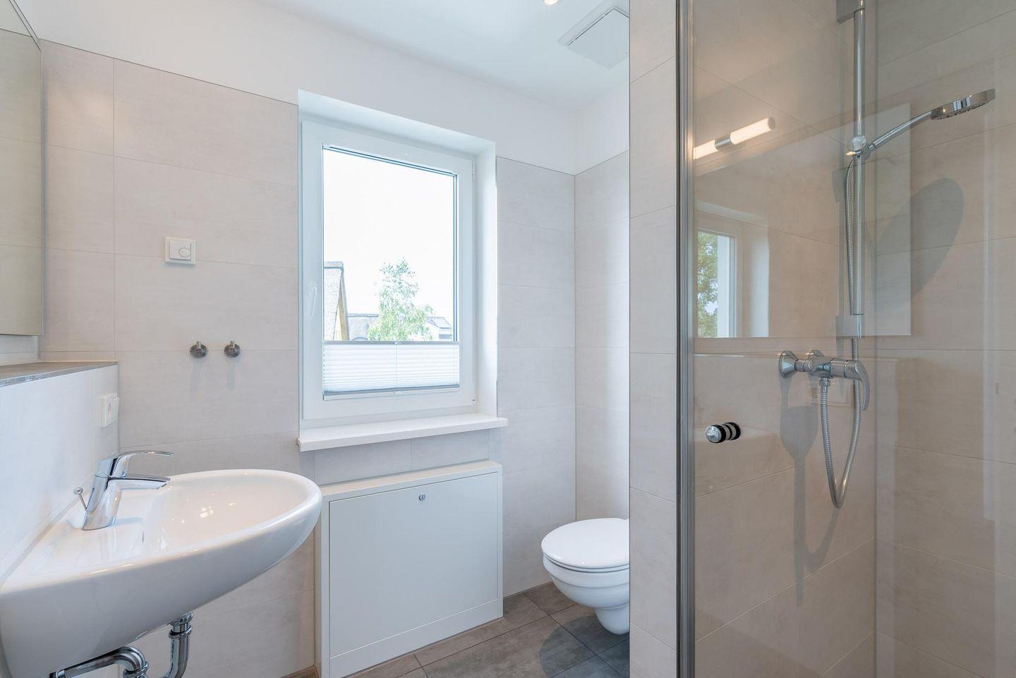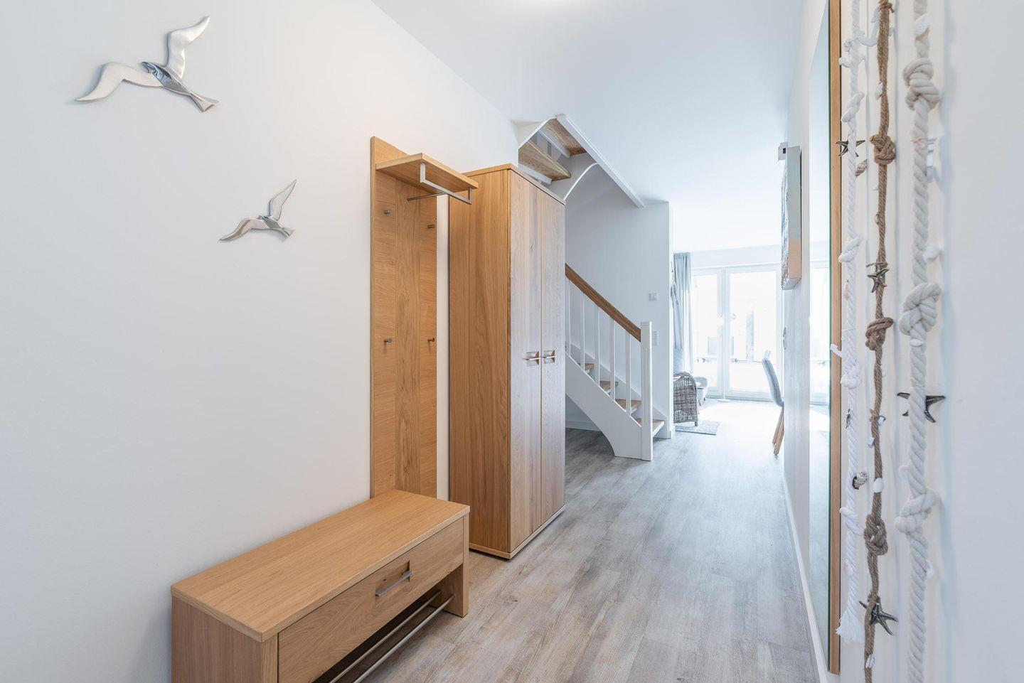 Kleiderschrank und Schuhschrank möbliert. Rechts von der Diele ist ein Gäste-WC