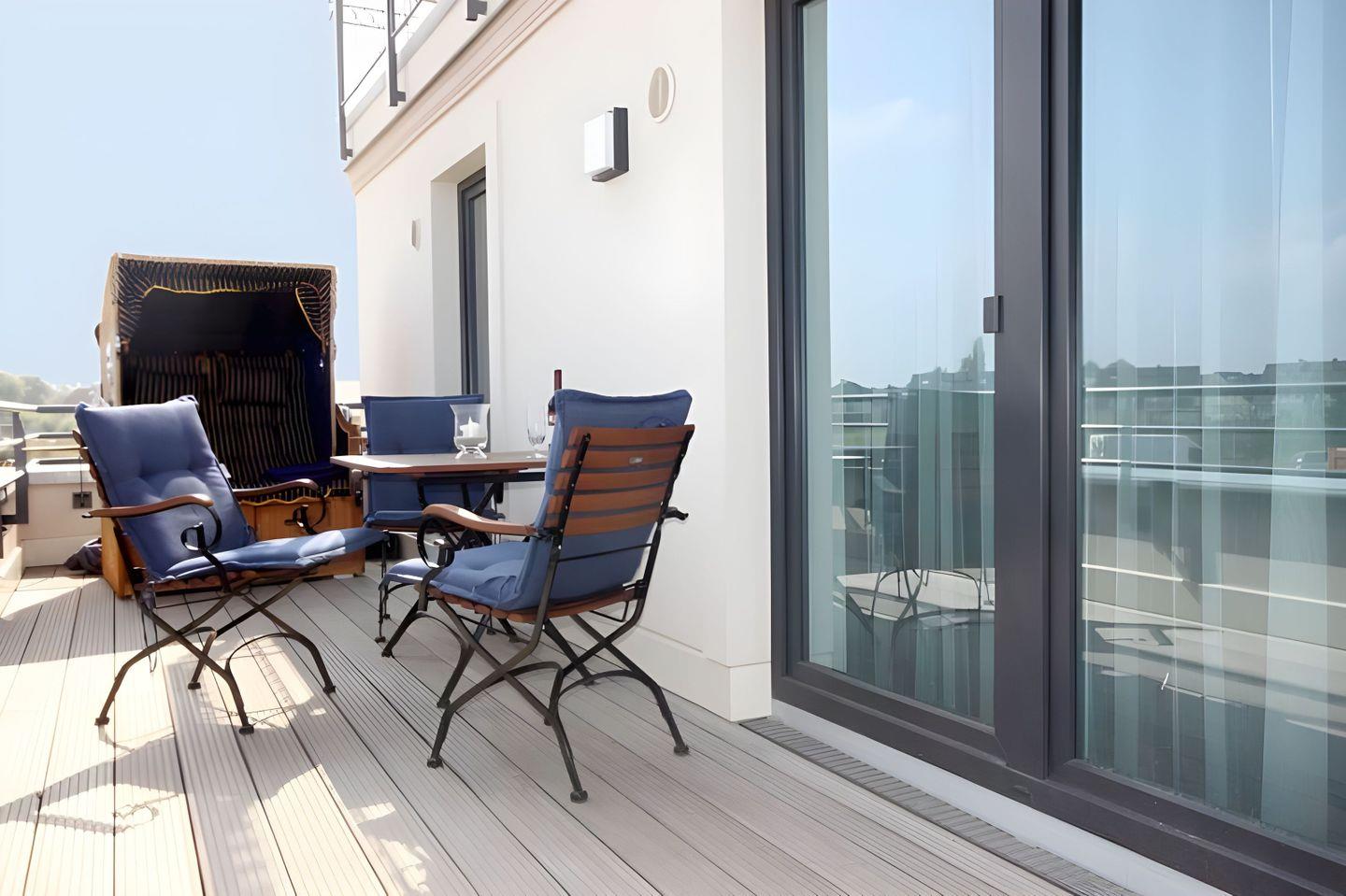 STRANDNAHE 3-RAUMWOHNUNG FÜR MAX. 2 ERWACHSENE UND 2 KINDER, 2 SCHLAFRÄUMEN, WANNENBAD, DACHTERRASSE (Balkon) MIT STRANDKORB UND SEITLICHEM MEERBLICK IM 1.OG.
