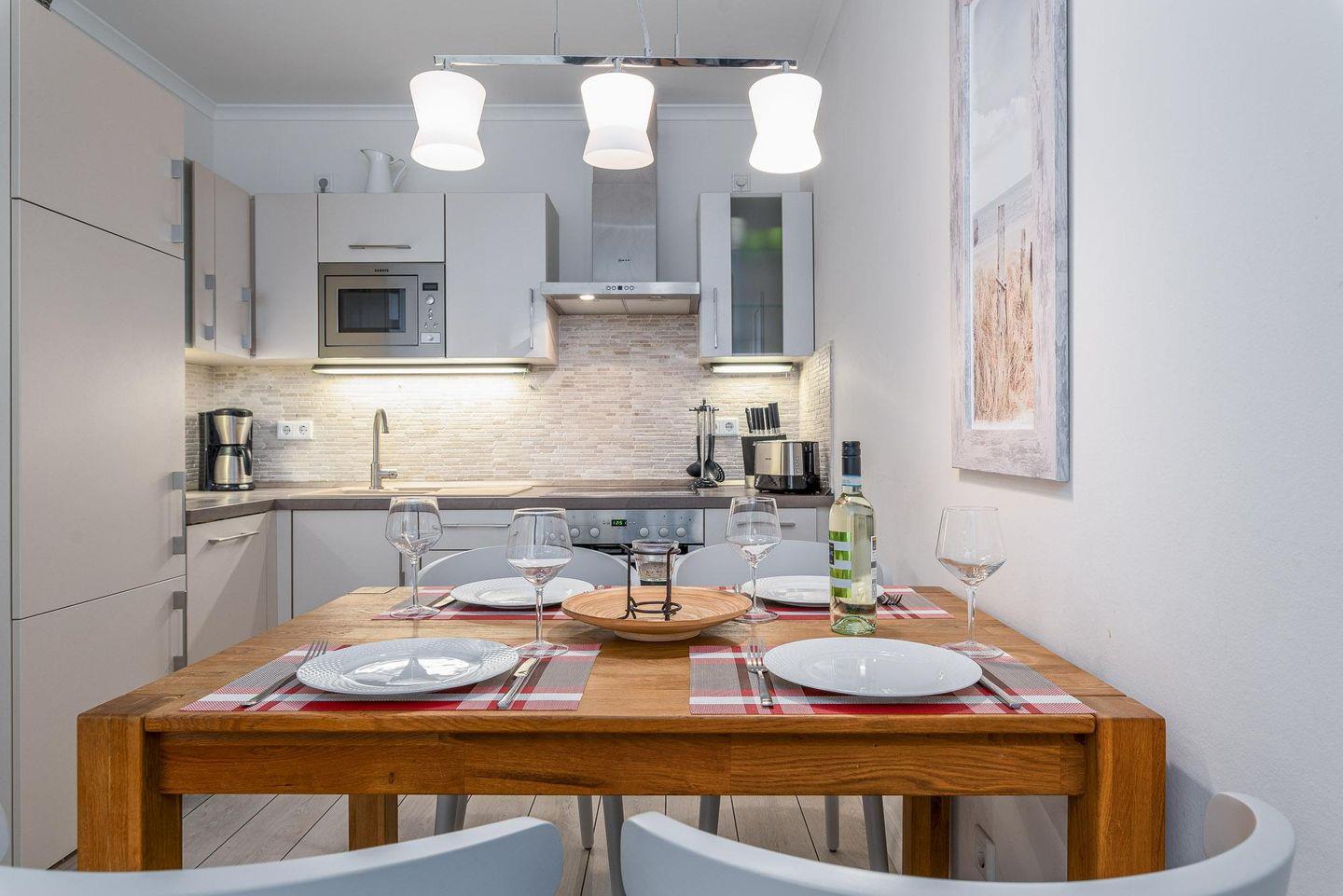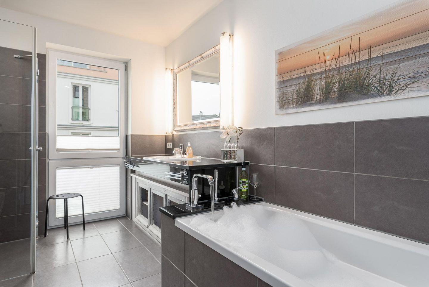 Genießen Sie im Sommer das erfrischende Nass der Ostsee und im Winter entspannen Sie nach einem ausgedehnten Spaziergang am Meer bei einem warmen Bad und lassen es sich anschließend bei einem Glas Wein gut gehen. Die perfekte Wohnung zu jeder Jahreszeit! Der lichtdurchflutete WOHNRAUM empfängt Sie mit einer bequemen Ledercouch und dem passenden Sessel, Couchtisch und Sideboard. Bunte Unterhaltung bieten Ihnen ein Flat-TV (32 Zoll), eine Musikanlage für iPod, iPhone, CD und ein Radio mit RDS. Ein Esstisch mit vier dazugehörigen Stühlen bietet Platz für gemeinsame Mahlzeiten. Die offene EINBAUKÜCHE ist voll ausgestattet mit Geschirrspüler, Mikrowelle, Cerankochfeld, Backofen, Dunstabzugshaube, Kühl-Gefrierkombischrank, Kaffeemaschine, Wasserkocher und Toaster. Im ERSTEN SCHLAFZIMMER erwarten Sie ein gemütliches Doppelbett (180 x 200 cm/ getrennte Matratzen), ein Kleiderschrank, ein Sideboard, ein Flat-TV und ein Radiowecker. Im ZWEITEN SCHLAFZIMMER befinden sich ein ausklappbares Schlafsofa (140 x 200 cm), ein Radiowecker und ein schmaler Kleiderschrank. Das elegante großes BAD besticht mit einem bodentiefen Fenster, einer ebenerdigen Dusche, einer herrlichen Badewanne sowie mehreren Ablagemöglichkeiten. Über den Wohnbereich gelangen Sie auf die traumhafte DACHTERRASSE (Balkon) in Nord-Ost-Ausrichtung mit seitlichem Meerblick. Diese ist komfortabel ausgestattet. Sitzmöbeln, ein Strandkorb als Ganzlieger sowie eine Markise. Die Ferienwohnung verfügt über einen ABSTELLRAUM, welcher von zwei Seiten nutzbar ist. Eine Seite bietet weiteren Stauraum für Ihr Gepäck und eine Seite fungiert als Hauswirtschaftsschrank (Staubsauger, Wischer, Besen, Eimer, Handfeger, Wäscheständer, Bügelbrett, Bügeleisen und Fußtritt vorhanden). Diverse Möbel in Wildeiche und der helle Eichenlaminatboden schaffen eine behagliche Atmosphäre in allen Räumen. Eine Fußbodenheizung sorgt überall für wohlige Wärme. Hier noch einige HINWEISE: Zu Ihrer Ferienwohnung gehört ein kostenfreier TIEFGARAGENSTELLPLATZ. Bitte beachten Sie die DURCHFAHRTSHÖHE von max. 1,90 m! Der im Gebäude installierte Aufzug erleichtert den Transport der mitgebrachten Koffer. Das kostenfreie WLAN in der Unterkunft ist ausschließlich für die Verwendung von Social Media und den Austausch von Bildern mit Familie und Freunden gedacht. Die Nutzung zum Streamen von Filmen ist nicht vorgesehen. Wäscheset, Kinderreisebett und Kinderhochstuhl können kostenpflichtig zugebucht werden. Über den Innenhof der Villa erreichen Sie den ABSCHLIESSBAREN FAHRRADRAUM sowie den angrenzenden Waschraum. Eine Waschmaschine und ein Trockner stehen zu Ihrer Verfügung (gegen Gebühr/ Münzautomat). Es handelt sich um eine Nichtraucherwohnung. Die Mitnahme EIN (es) HUND (es) ist erlaubt und wird gesondert berechnet (10,00 €/ÜN und einmalig 25,00 € Haustierendreinigung). Hundestrände finden Sie in Richtung Heiligendamm in ca. 500m Entfernung. Ab Aufgang 9. In Richtung Nienhagen ab Aufgang 1. Für die dritte und vierte Person (ab 3 Jahre) wird ein Aufpreis in Höhe von 10,00 €/ÜN pro Person berechnet. Sichern Sie sich einen der begehrten STRANDKÖRBE nur ein paar Meter entfernt von den rauschenden Wellen der Ostsee (Anfang Mai - Ende August) und buchen Sie jetzt zu besonderen Konditionen (12,00 € pro Tag oder 75,00 € pro Woche).