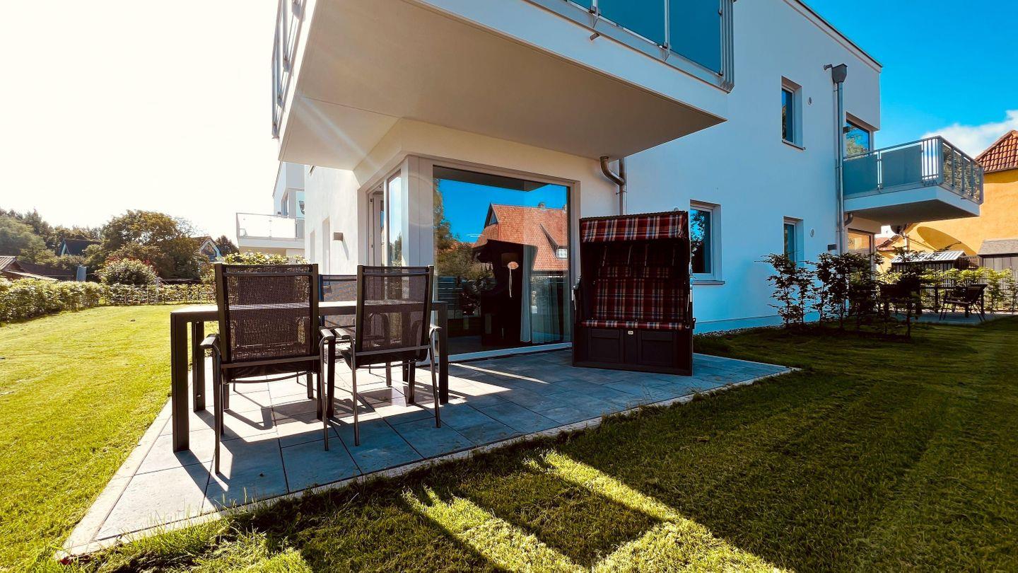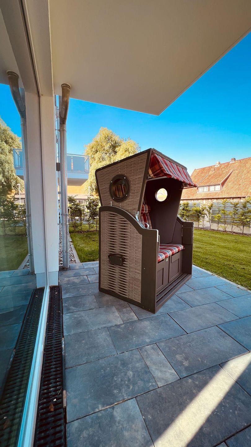 geräumige Terrasse mit Strandkorb und ein zugehöriger kostenfreier
