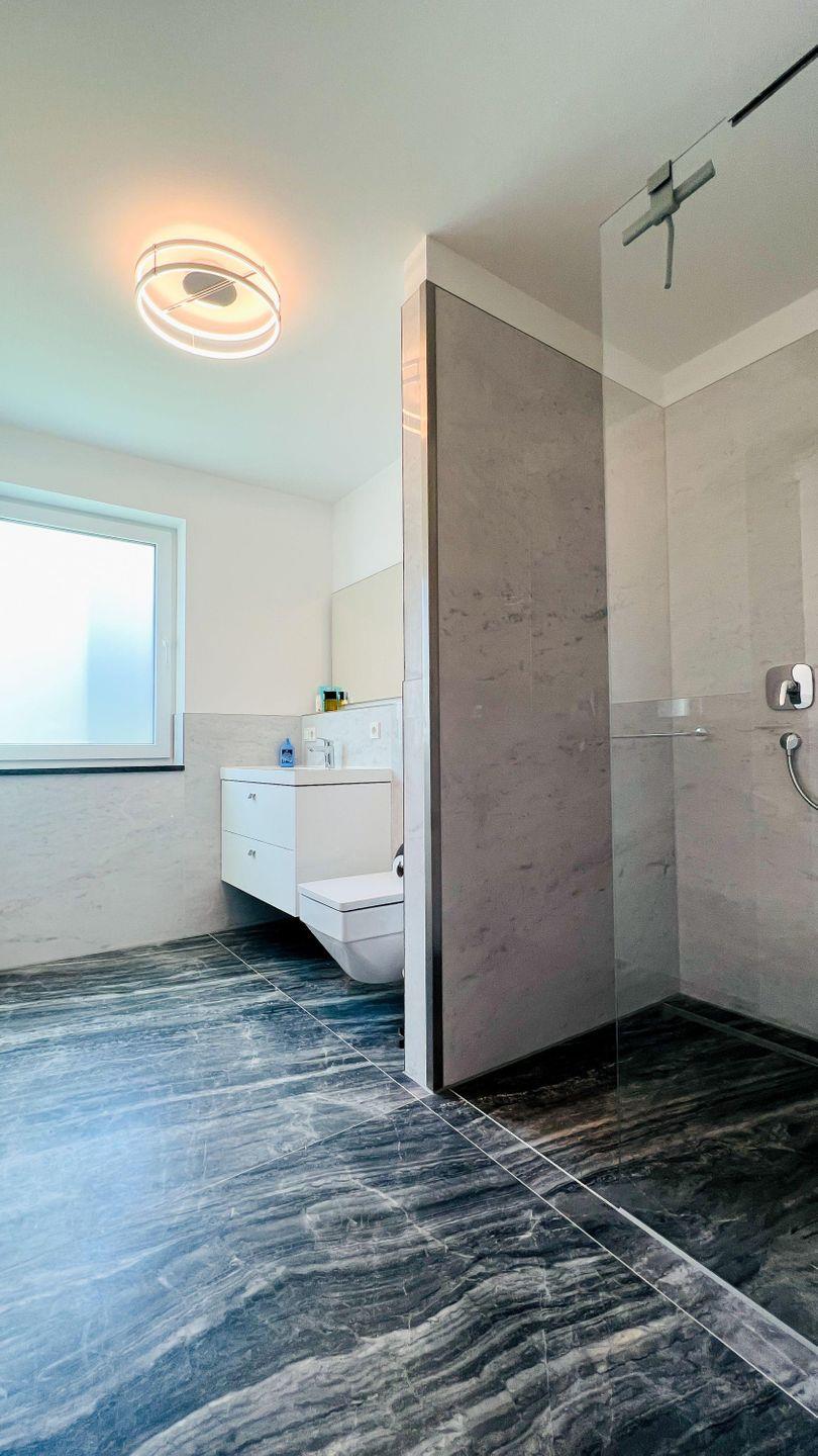 Esszimmer mit offener Einbauküche sowie ein Bad mit ebenerdiger Dusche. Eine