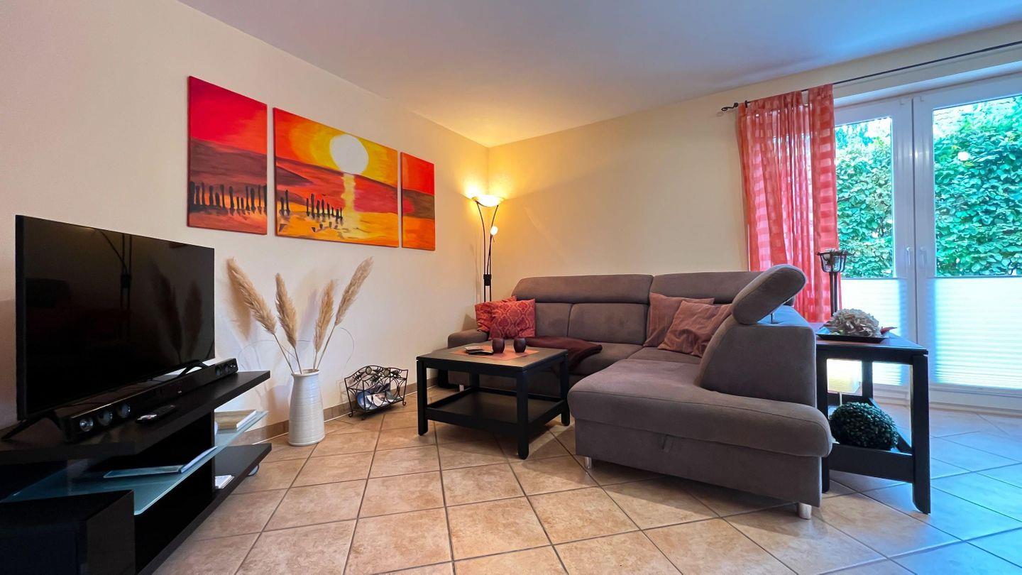 Dank bodentiefer Fenster und einer angrenzenden Terrasse strömt das Wohnzimmer