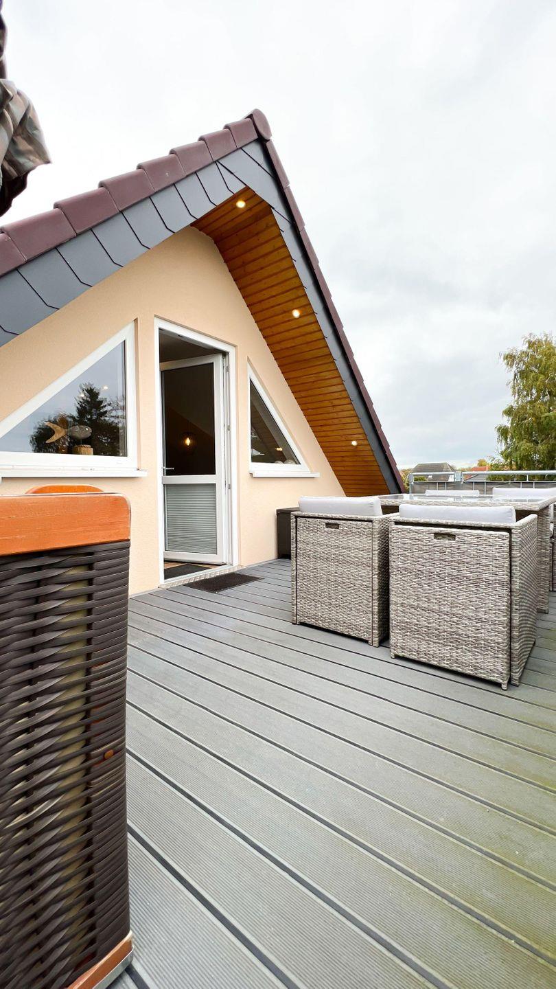 auf eine großzügige Dachterrasse, die mit einem gemütlichen Strandkorb zum