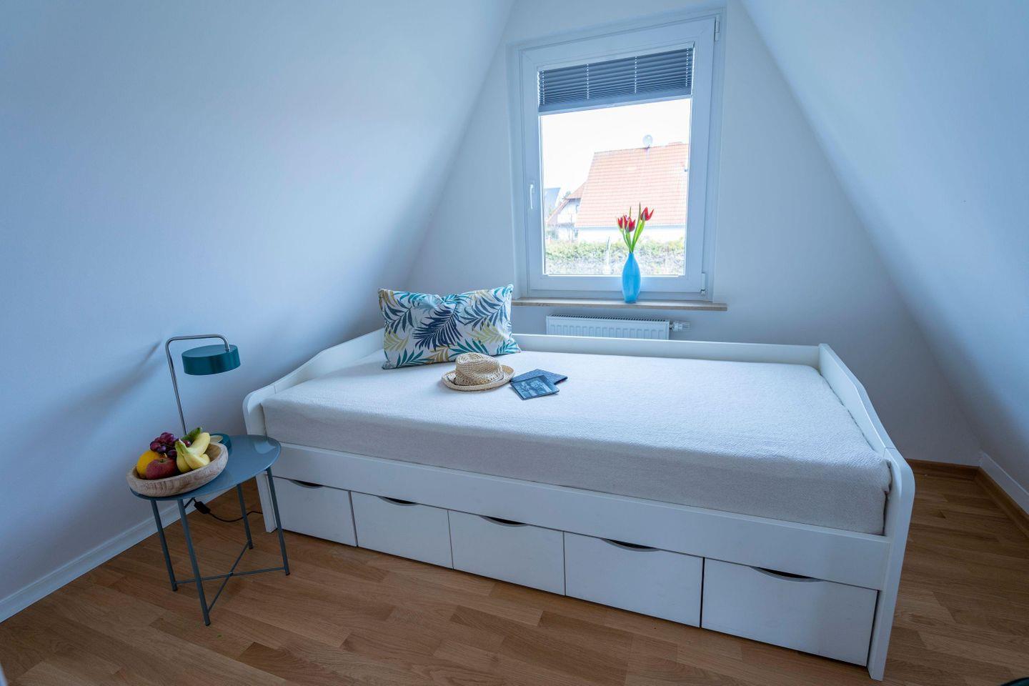 cm) befindet sich in einem offenen Bereich, das Einzelbett (90 x 200 cm) steht