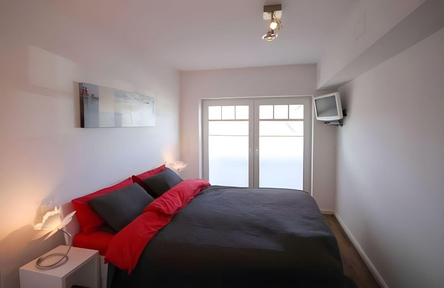 Doppelbett, einen Kleiderschrank und einen weiteren Flatscreen-TV. Das Duschbad