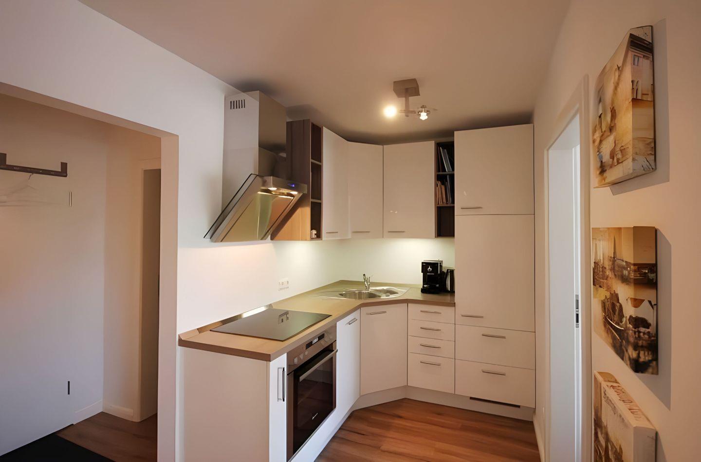 offene Einbauküche ist voll ausgestattet mit Geschirrspüler, Kühlschrank mit